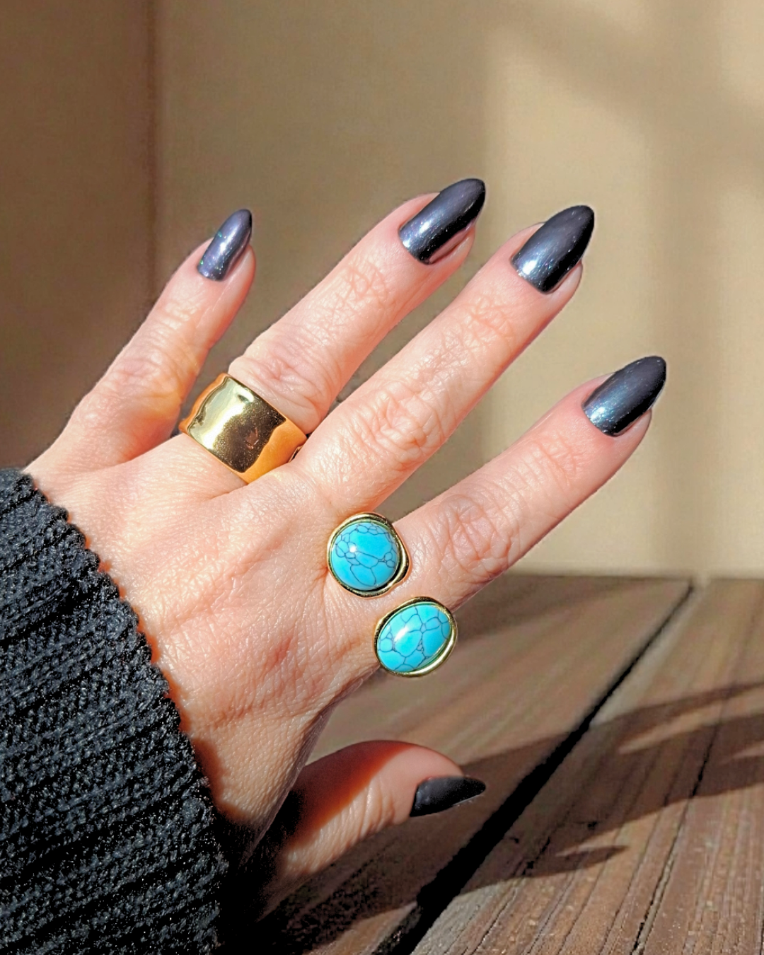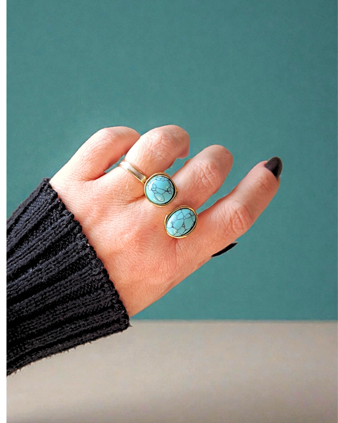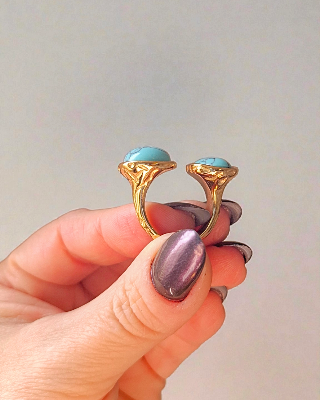 Anel com dois pontos de pedra howlita azul. Banho de ouro. Ajustável dos tamanhos 16 ao 18.