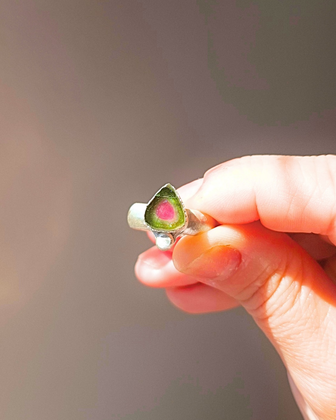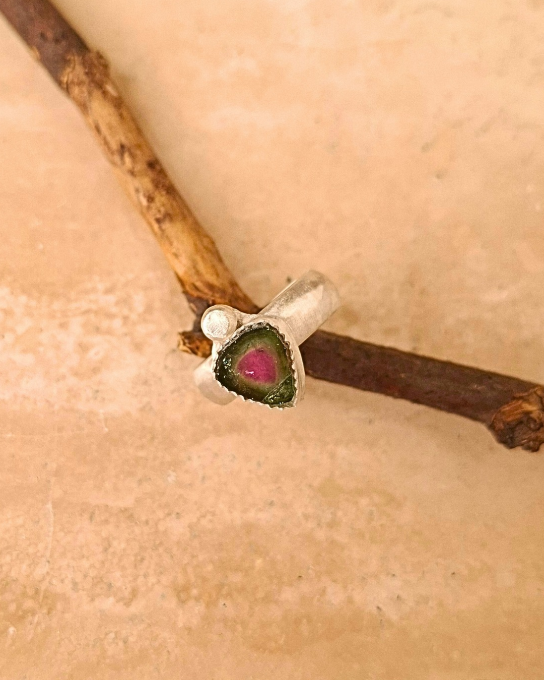 Anel em prata 925 e pedra natural turmalina melancia. Tamanho 17.