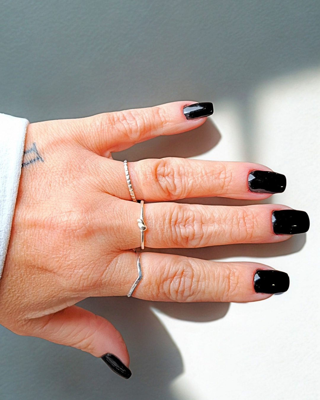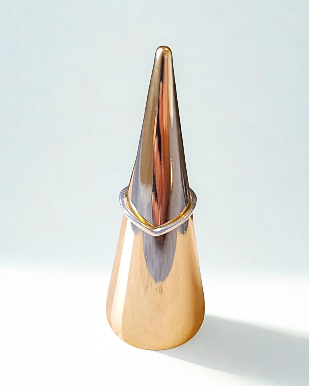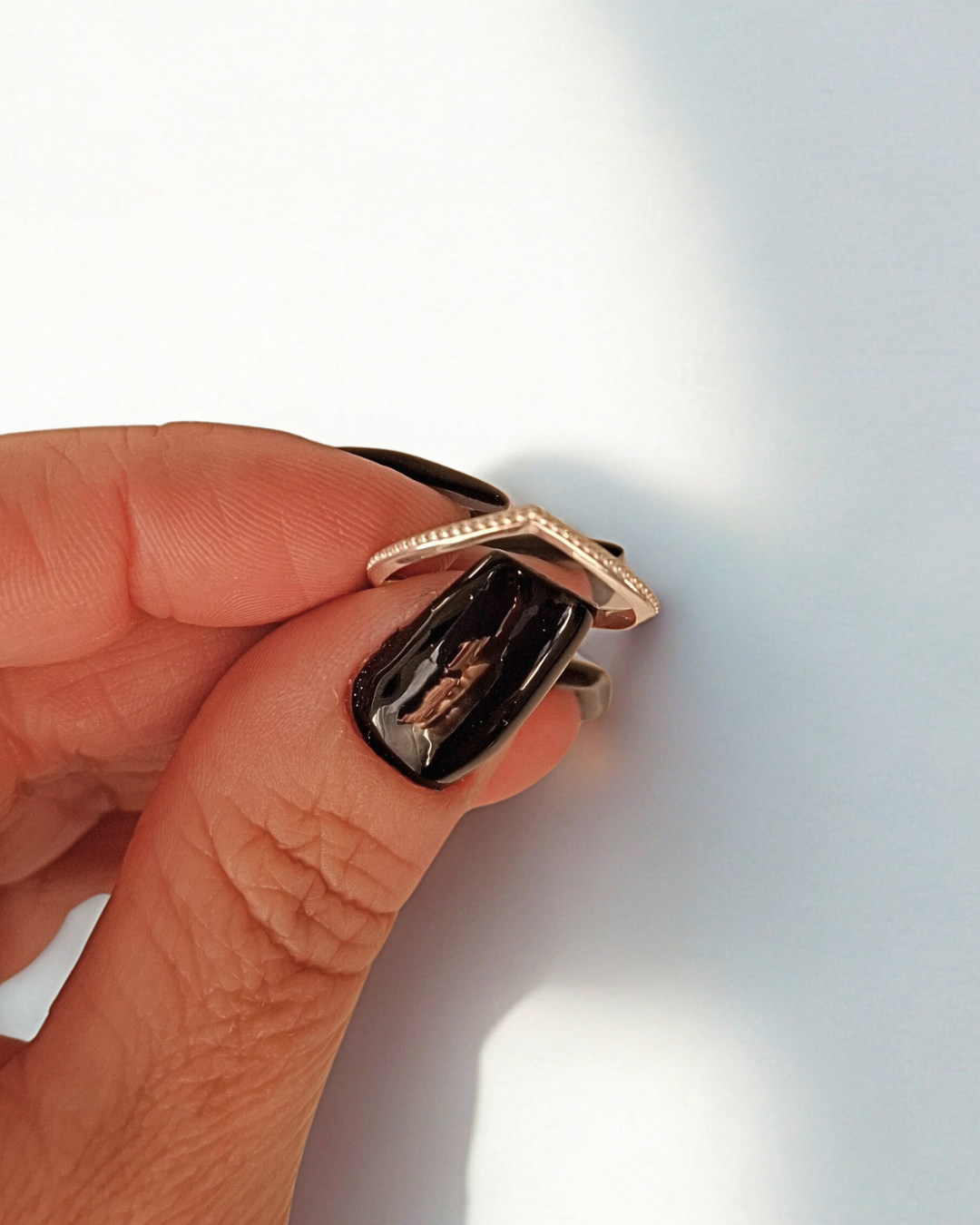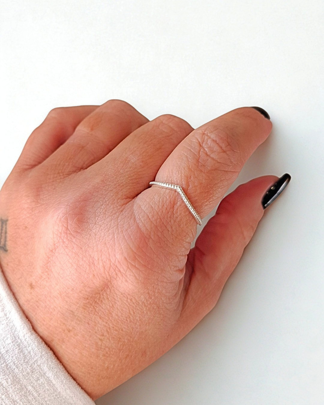 Anel em prata 925 em V com dois lados. Um lado liso e brilhante e o outro com textura. Pode ser usado das duas formas.