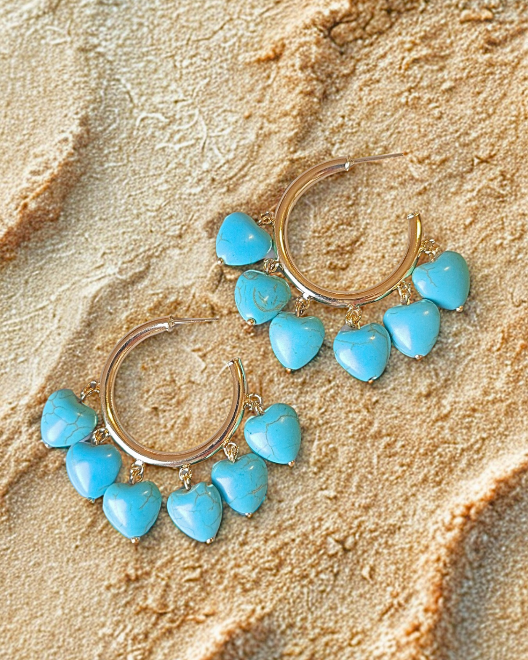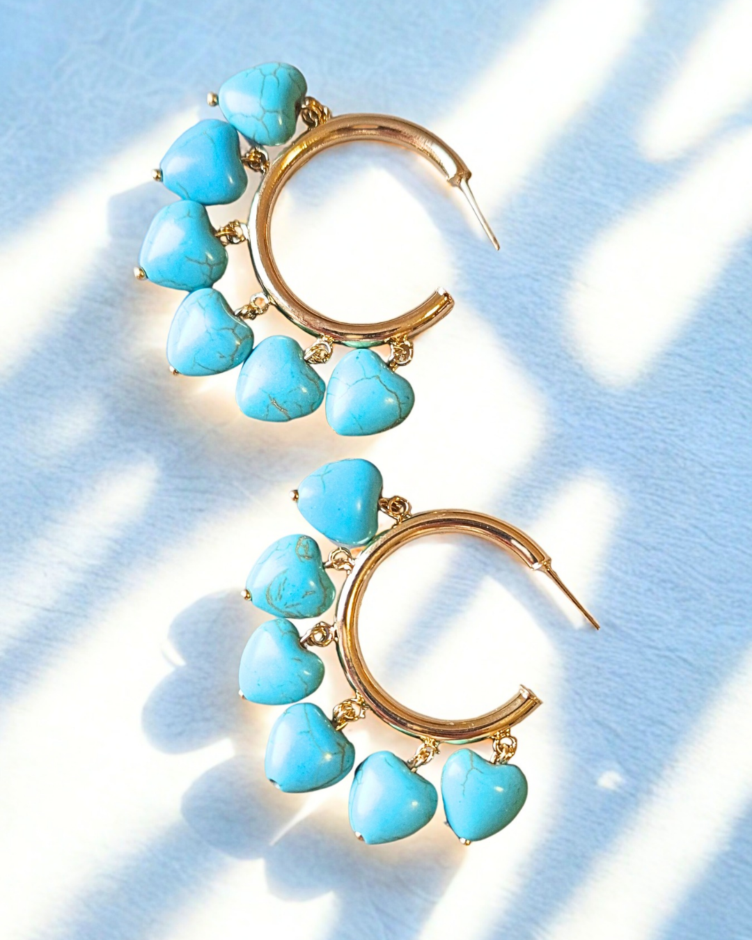 Argola no banho de ouro e pingentes de pedra howlita azul.