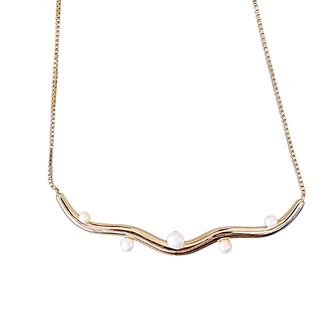 Colar modelo aro no banho de ouro com pérolas. Possui extensor. 45cm de comprimento.