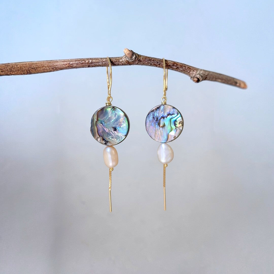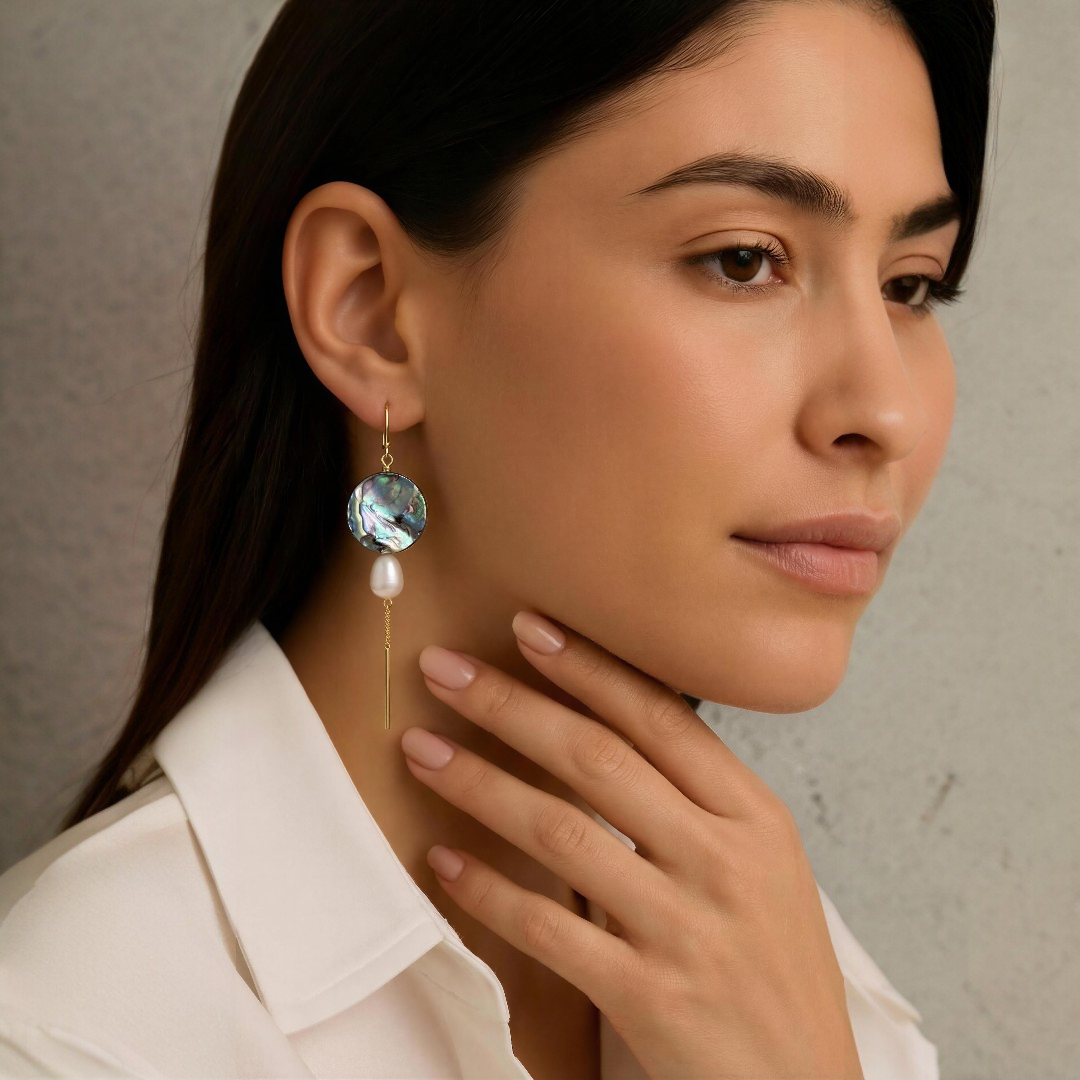 Brinco com banho de ouro e pedras naturais abalone e pérola de água doce.