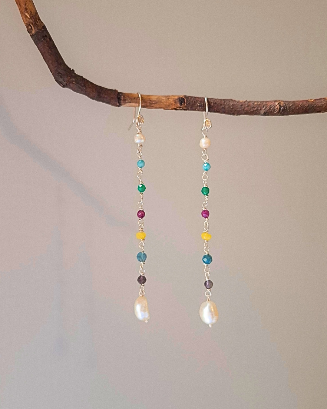 Brinco em prata 925 e pedras naturais amazonita, ônix verde, rubi, jade amarela, apatita azul, ametista e pérola. Super leve, Base anzol.