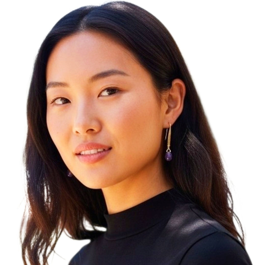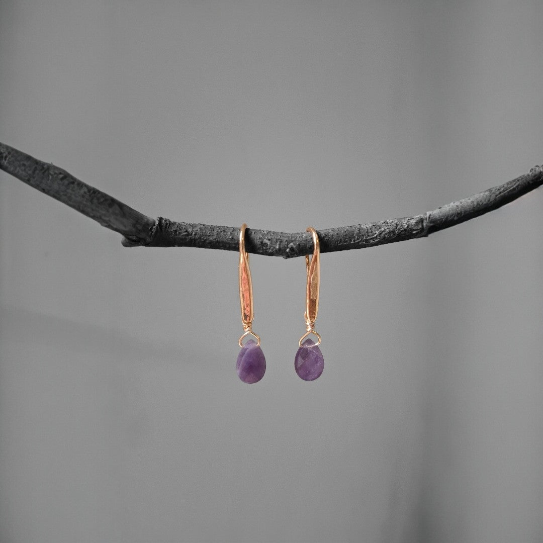 Brinco de base anzol com banho de ouro e pingentes de gotas facetadas de ametista.