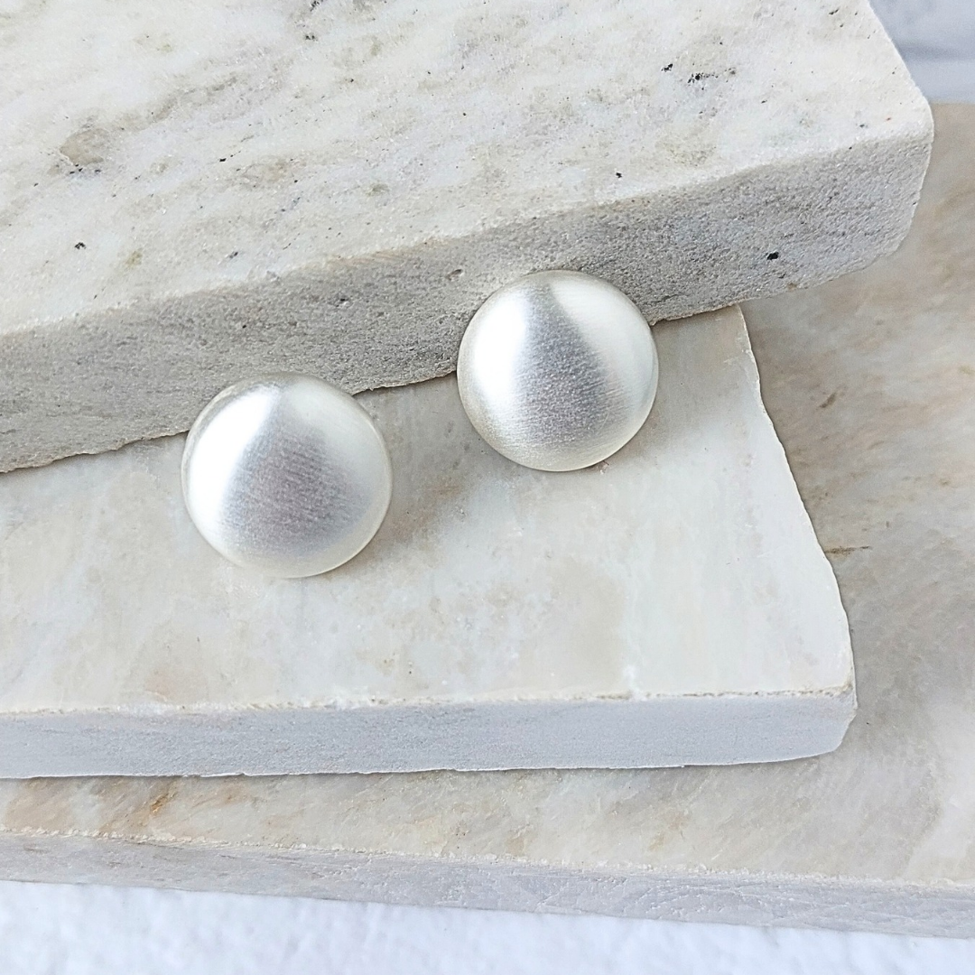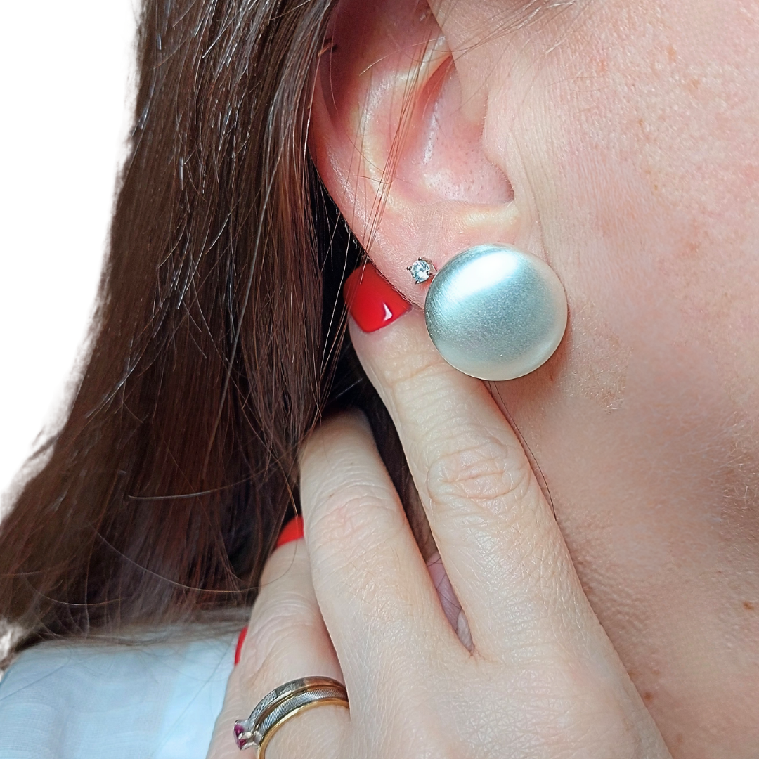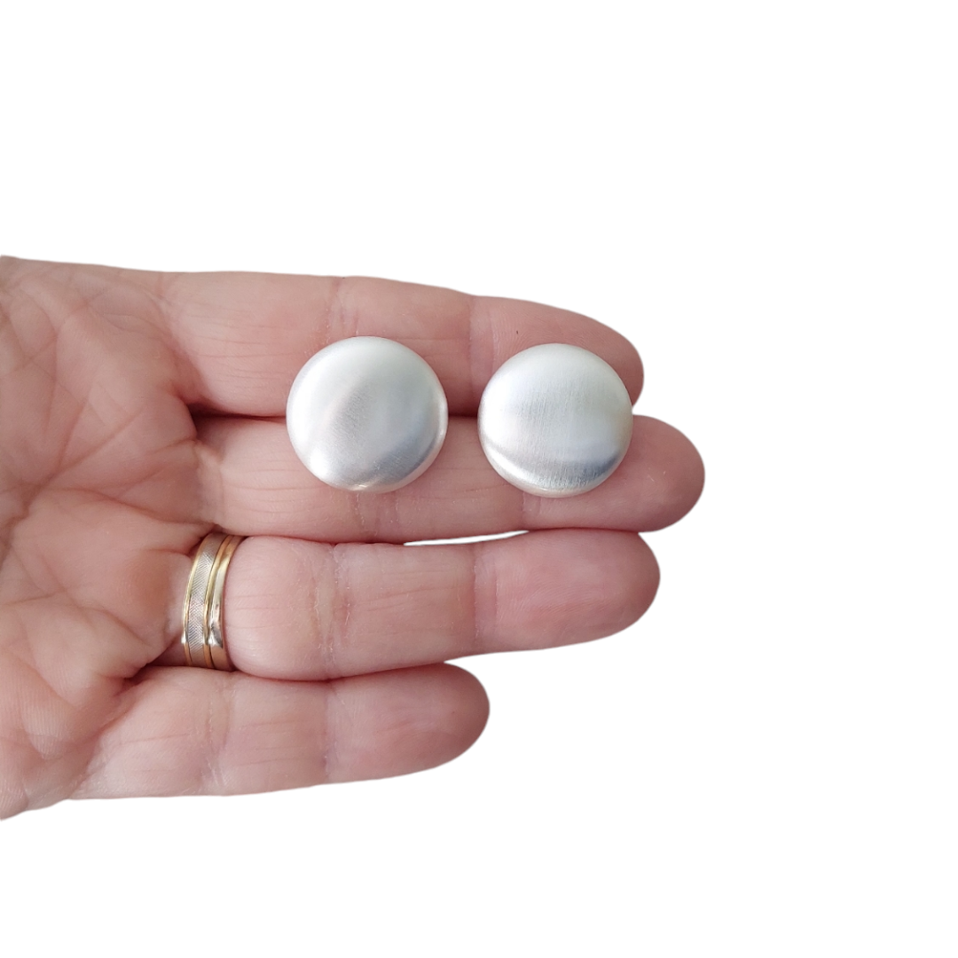 Brinco modelo botão com acabamento fosco e banho de ródio branco.