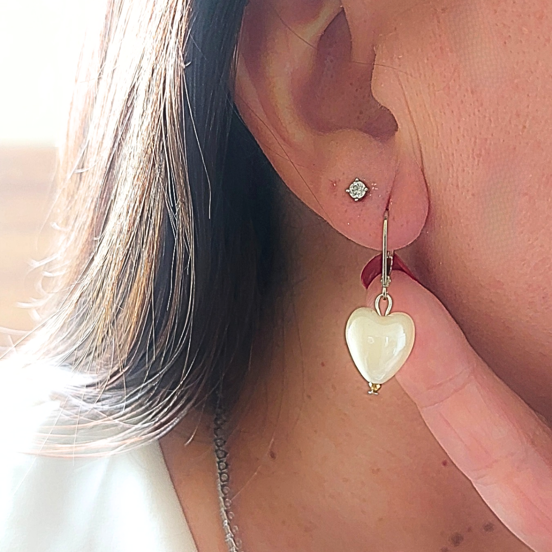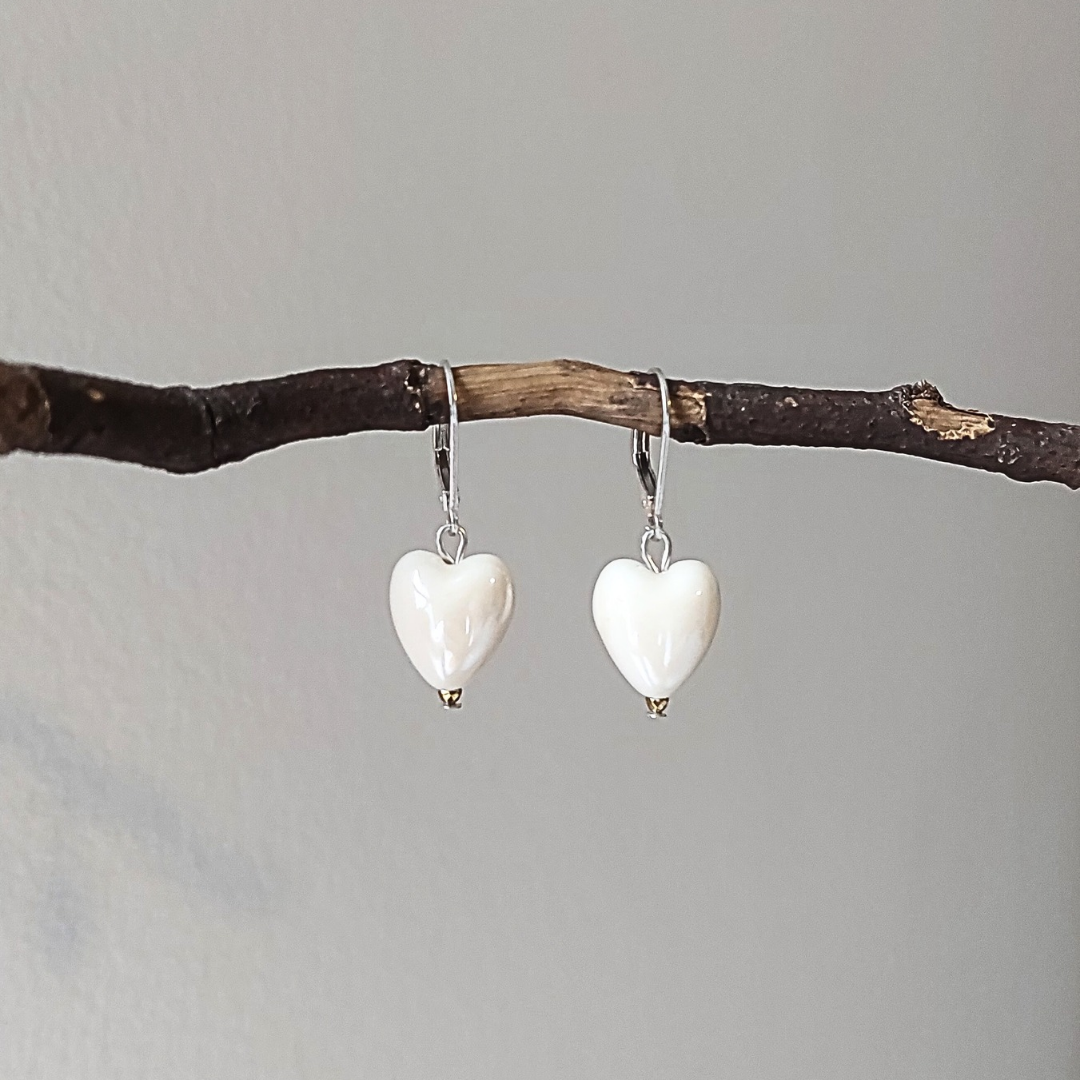 Brinco de base em prata 925 e pingentes de coração em cerâmica com hematita dourada.