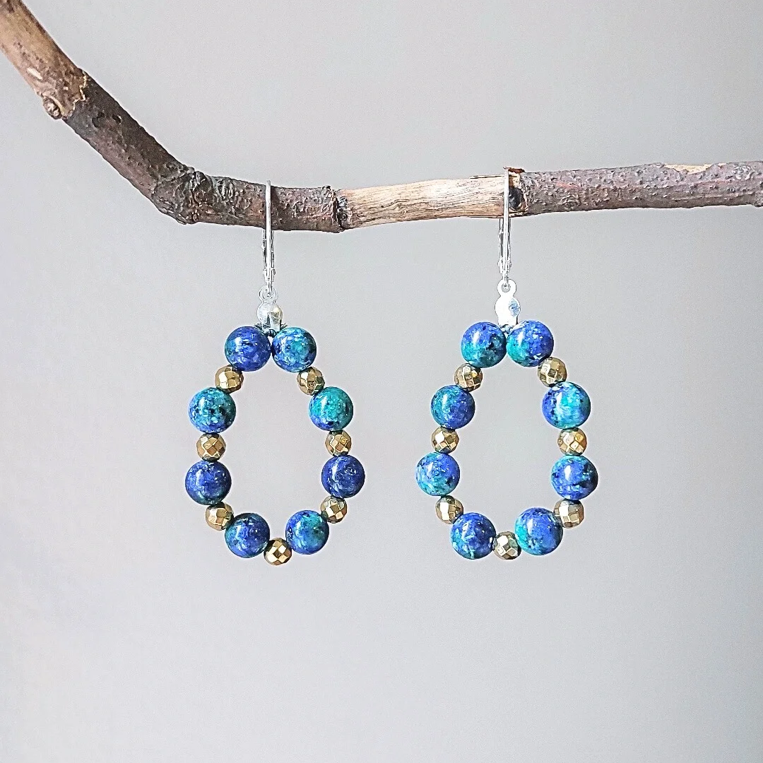 Brinco de pedras naturais crisocola e hematitas douradas. Em prata 925.