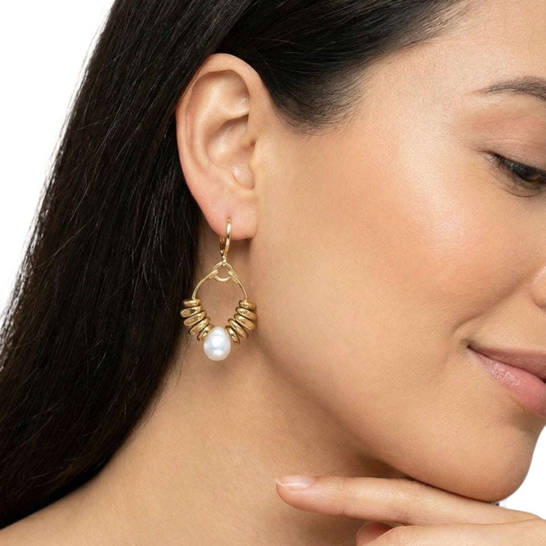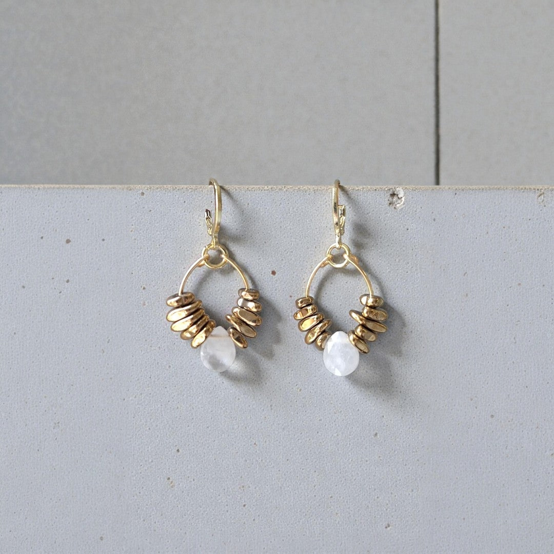 Brinco de pedras naturais hematitas com gota de quartzo cristal. Banho de ouro.