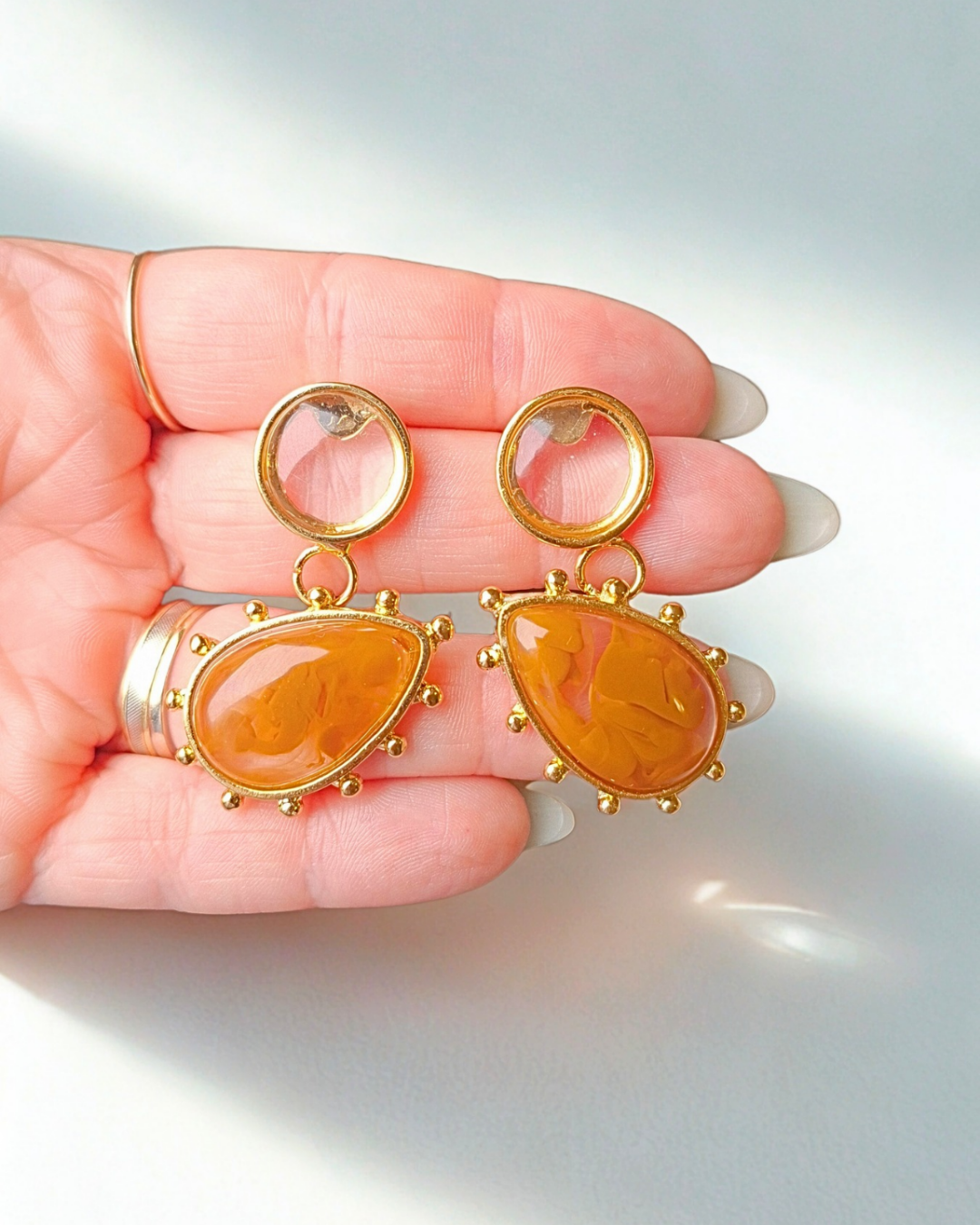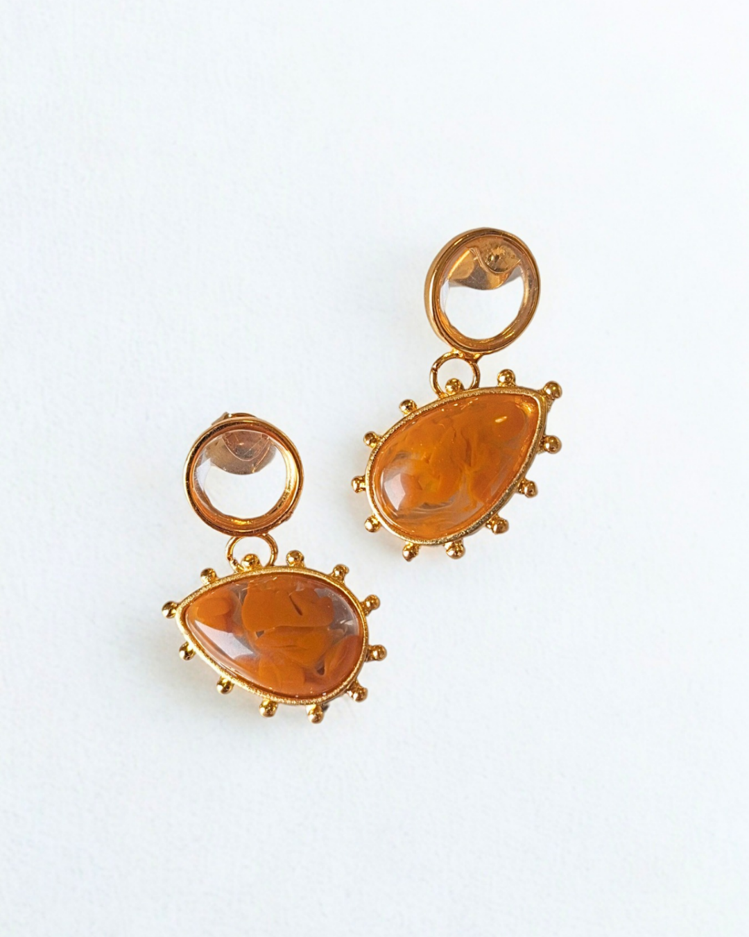 Brinco de gota marrom e transparente em resina. Banho de ouro.