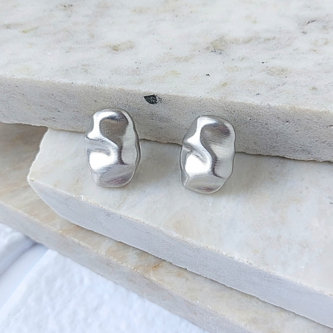 Brinco textura martelado com acabamento fosco e banho de ródio branco.