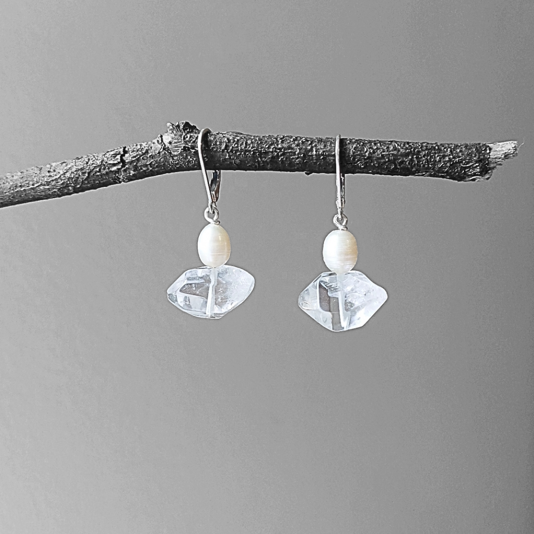 Brinco em prata 925, cristal de rocha e pérola de água doce.