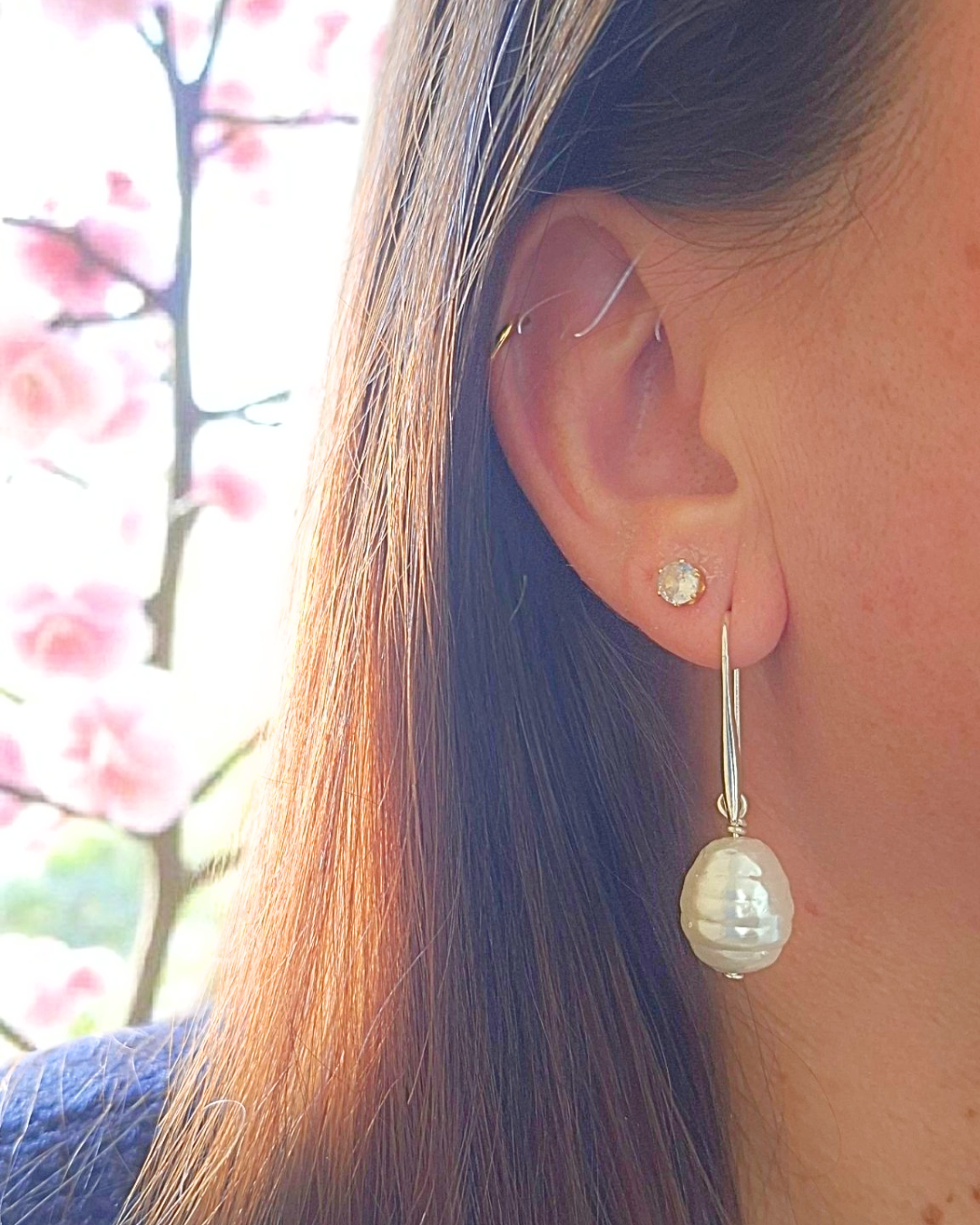 Brinco em prata 925 com base gancho sem tarraxa e com pérola shell branca em gota.