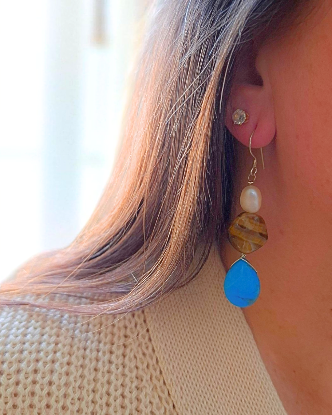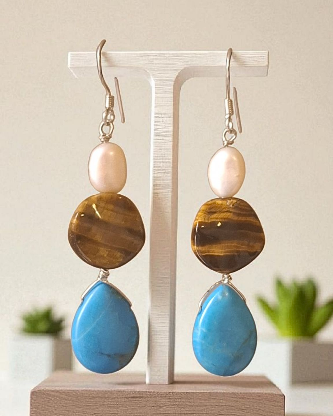 Brinco em prata 925 com pedras naturais olho de tigre, turquesa e pérola. Base anzol.
