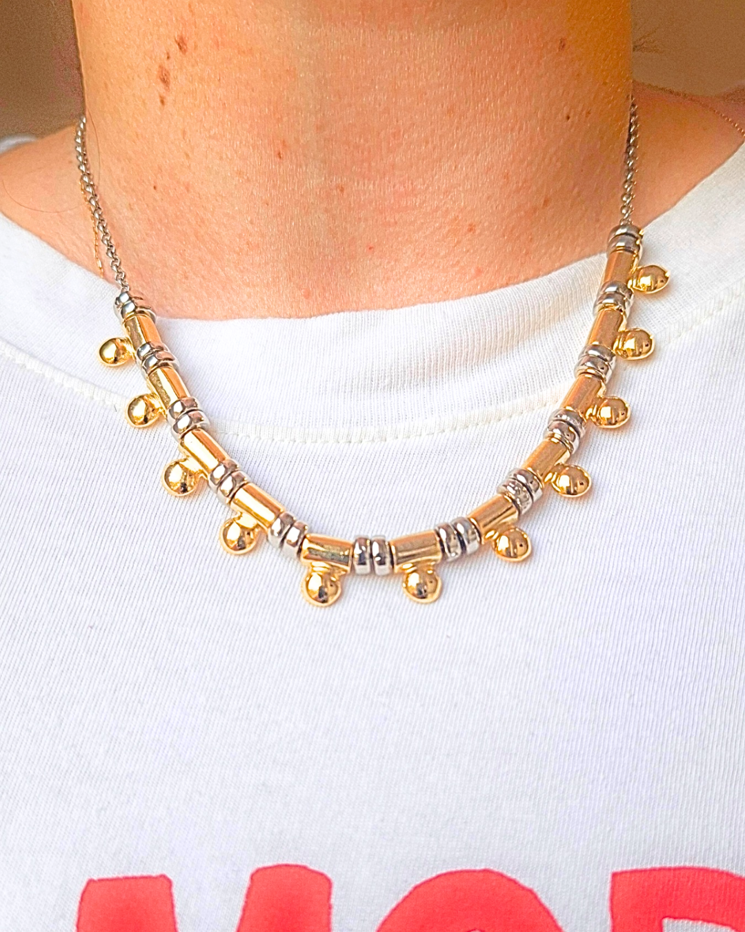 Colar com esferas e tubos. Banho de ouro e extensor. 45cm.