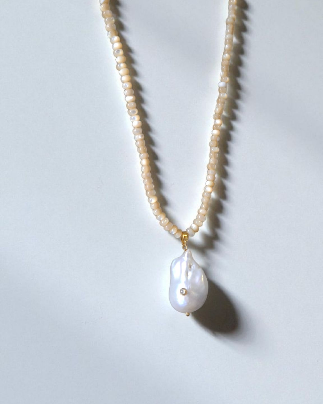 Colar de pedras naturais madrepérola e pingente em pérola barroca com ponto de luz. 45cm e extensor.