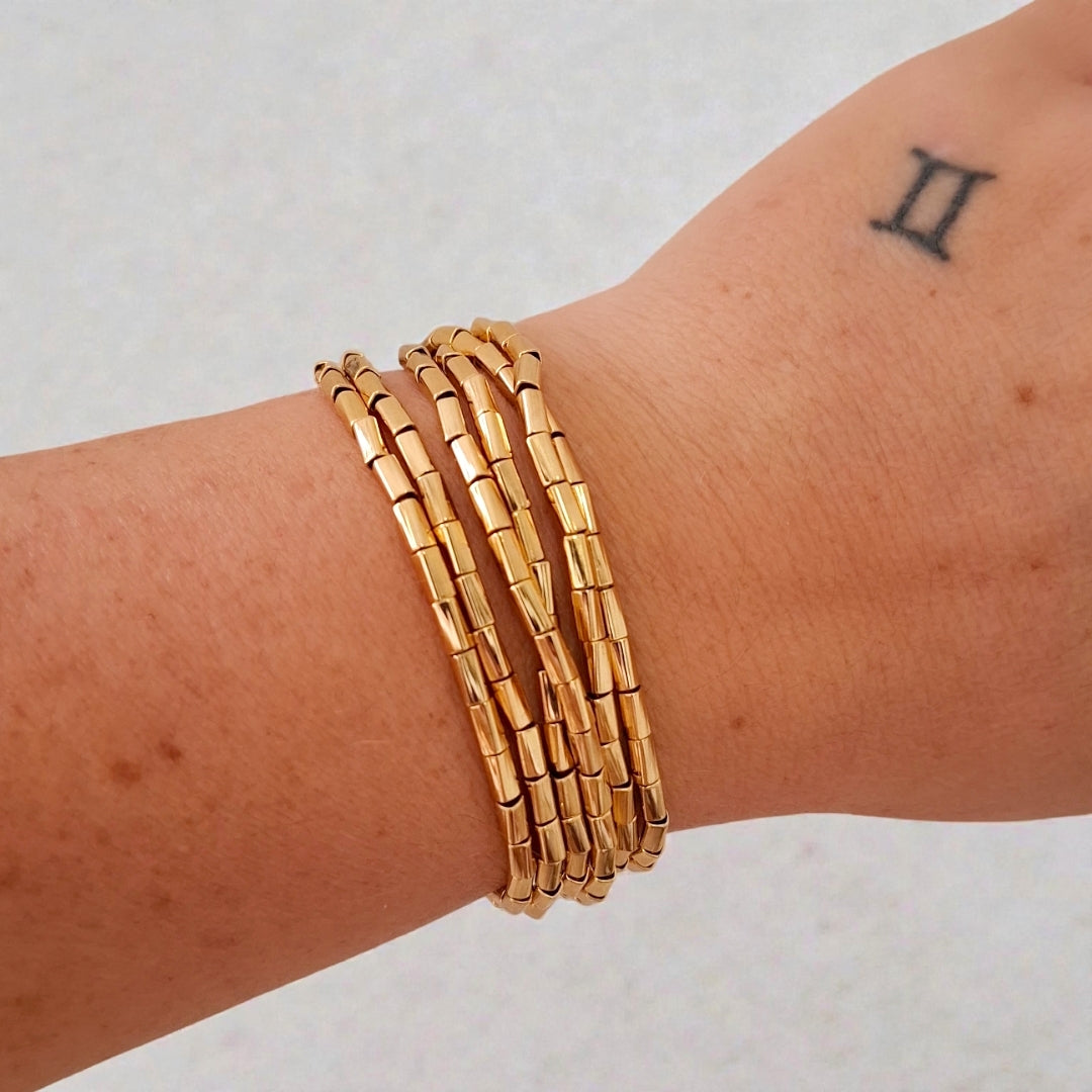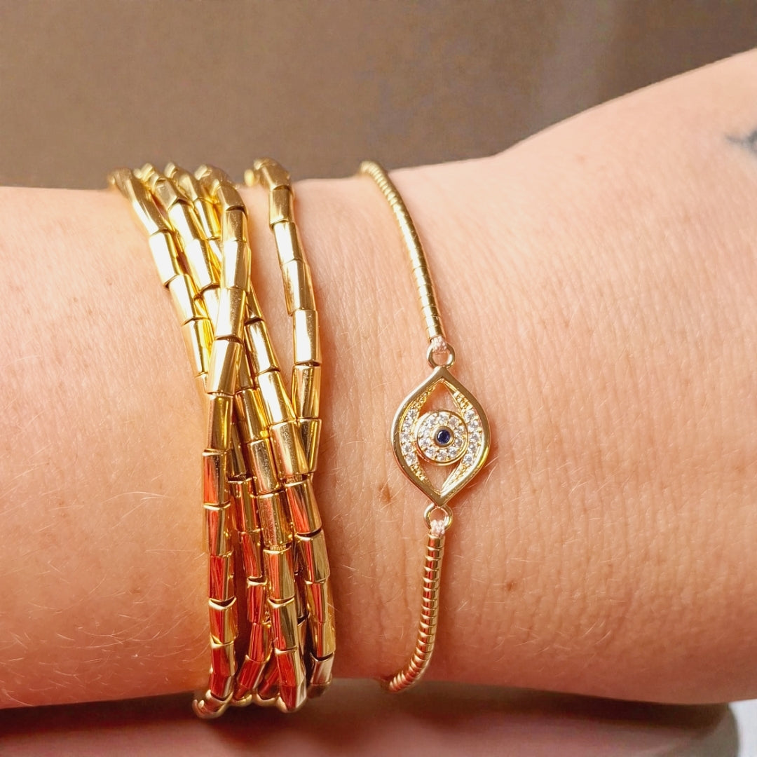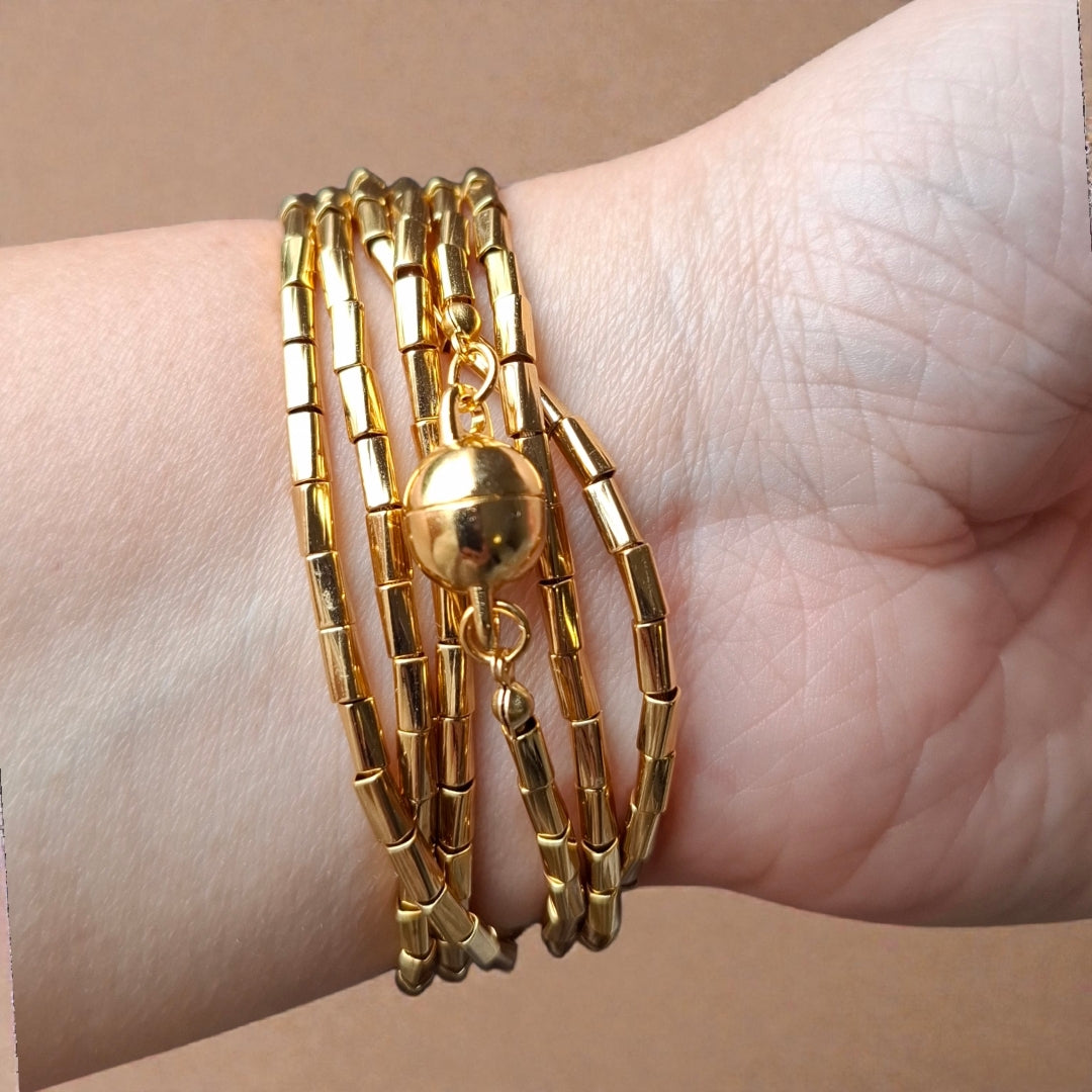Colar de canutilhos dourado com fecho íma. 1,20 de comprimento. Pode ser usado no pulso com várias voltas ou no pescoço com duas ou três voltas.