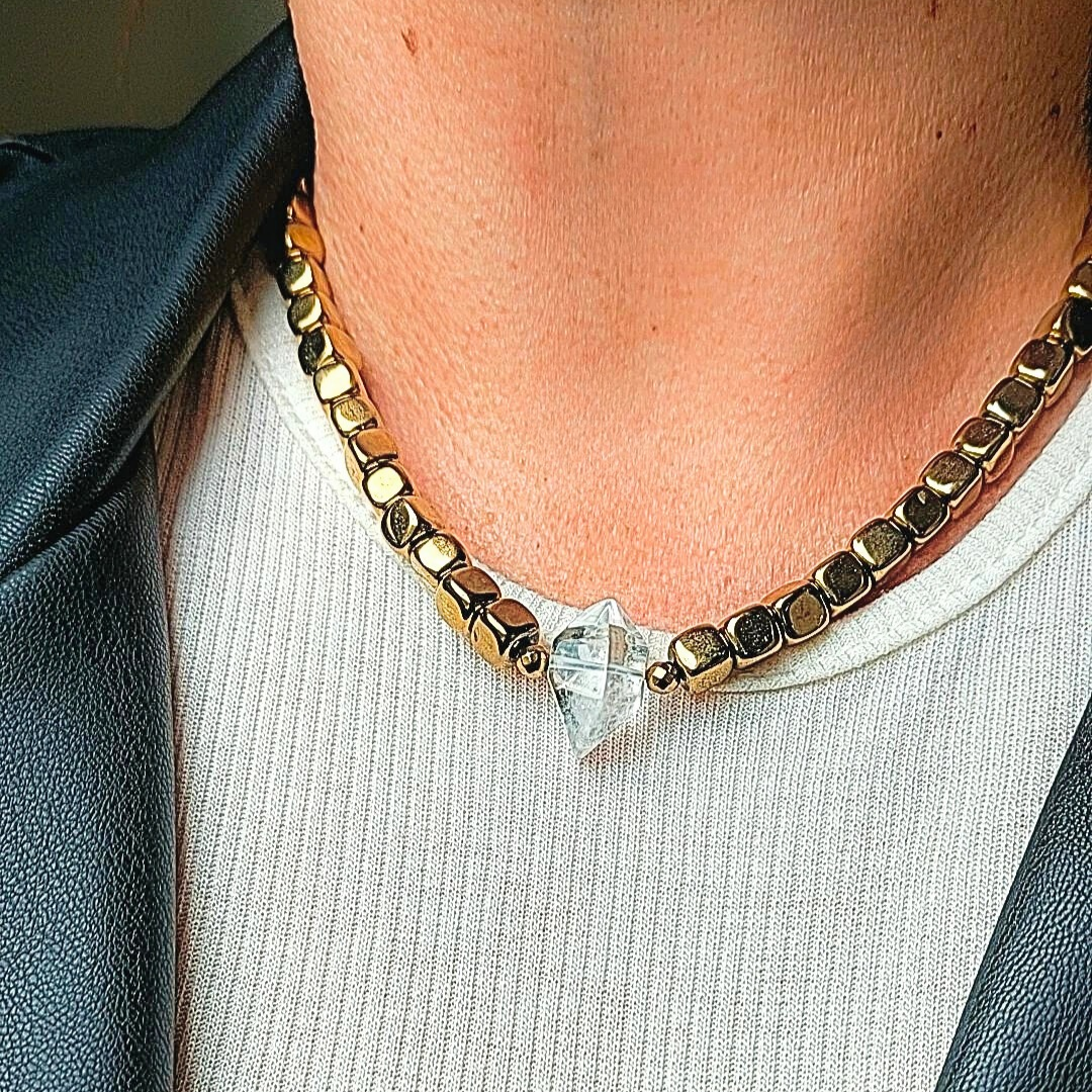 Colar de pedra natural hematita dourada e cristal de rocha. Acabamento em prata 925. 40cm de comprimento. Possui extensor de 5cm.