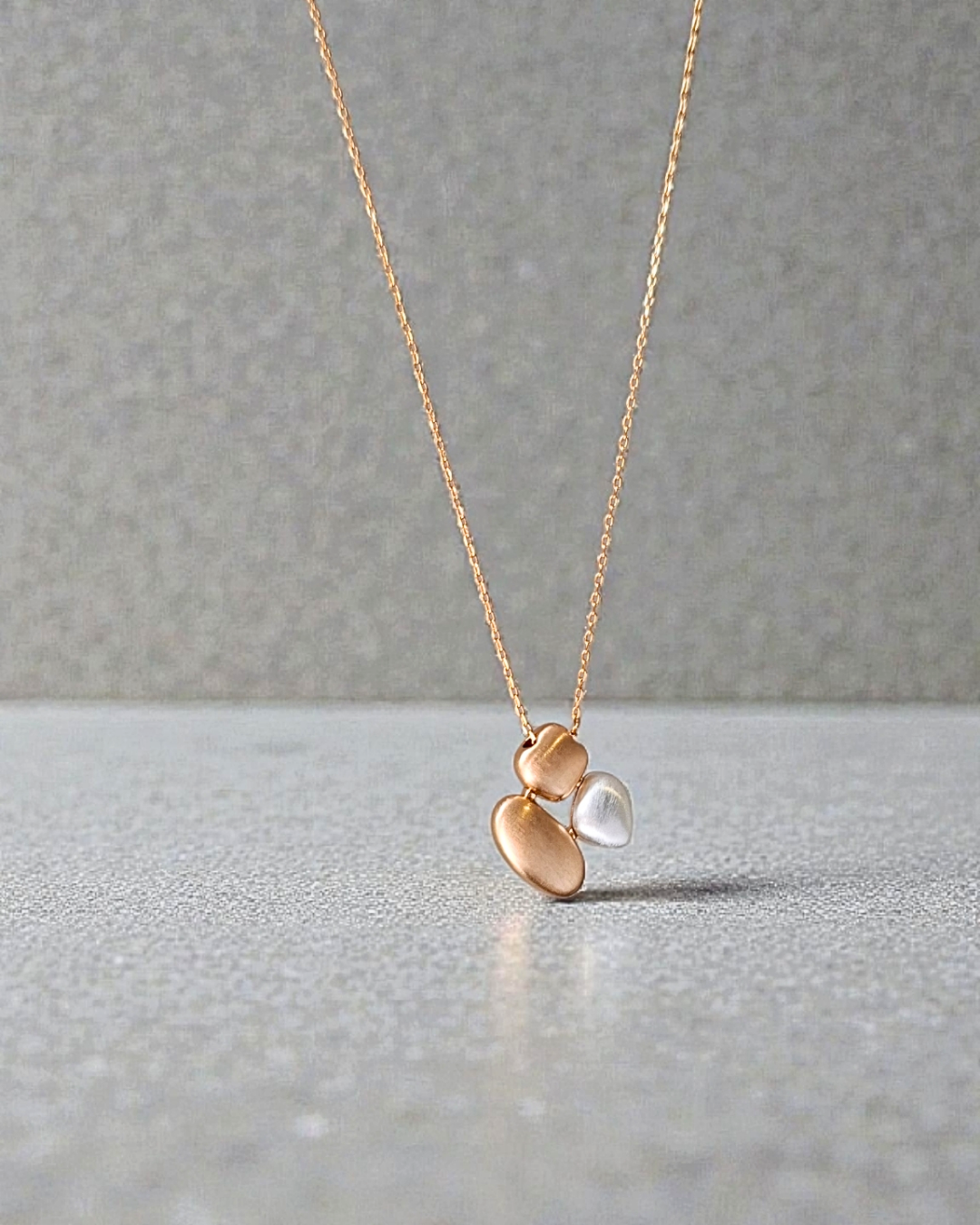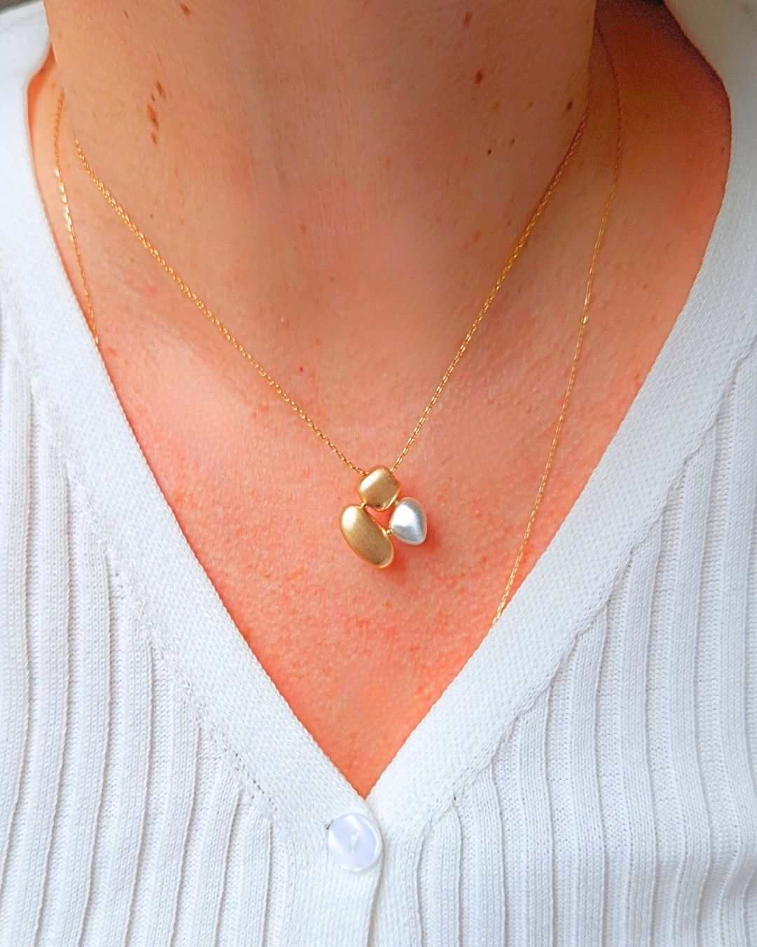 Colar de forma orgânica e mix de banhos de ouro e ródio branco. 45cm com extensor.
