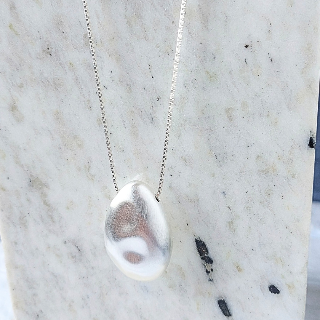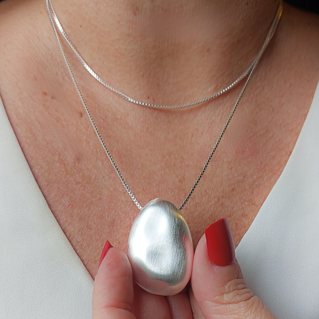 Colar longo com pingente em gota com acabamento fosco e banho de ródio branco. 80cm de comprimento.