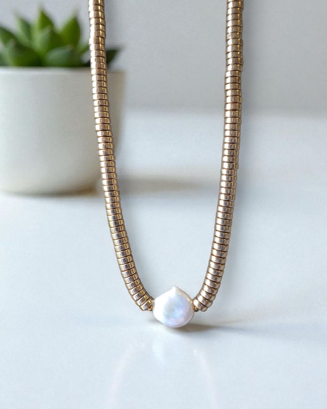 Colar de pedras naturais hematitas douradas e pérola natural ao centro. 45cm.