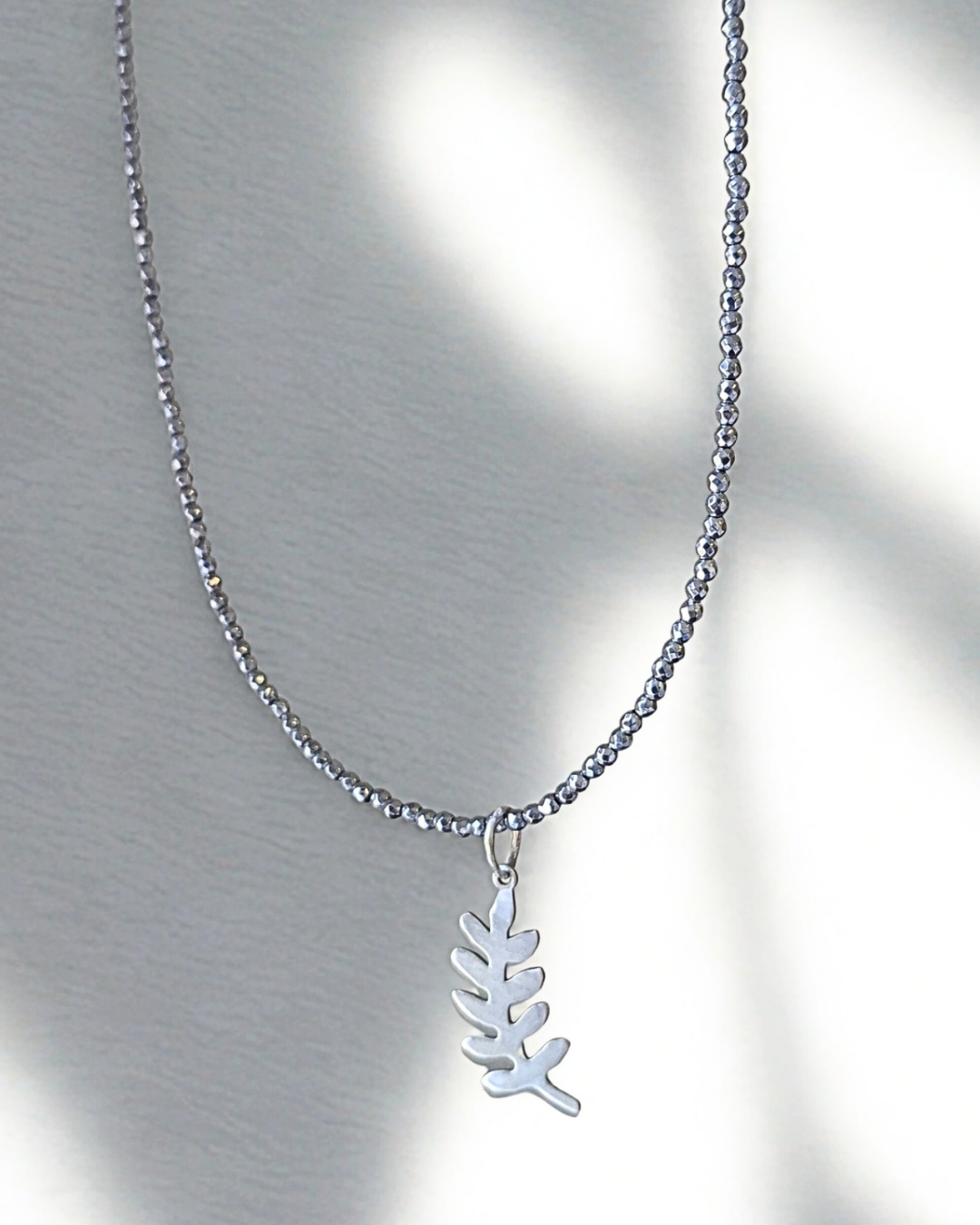 Colar de pedras naturais hematitas com pingente em prata 925 de louro. 45cm de comprimento.