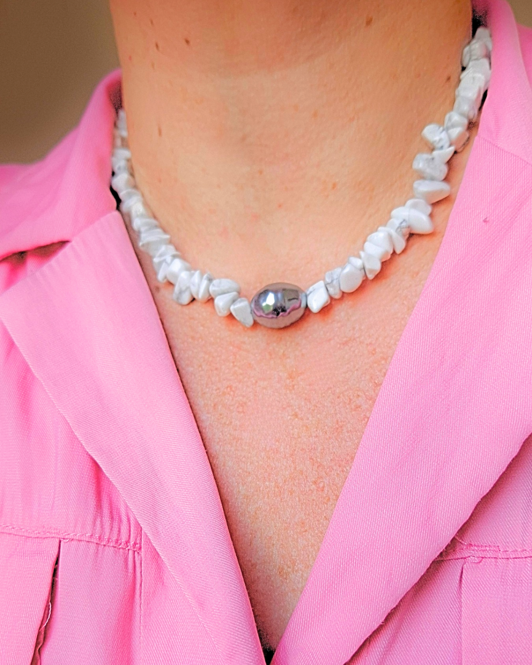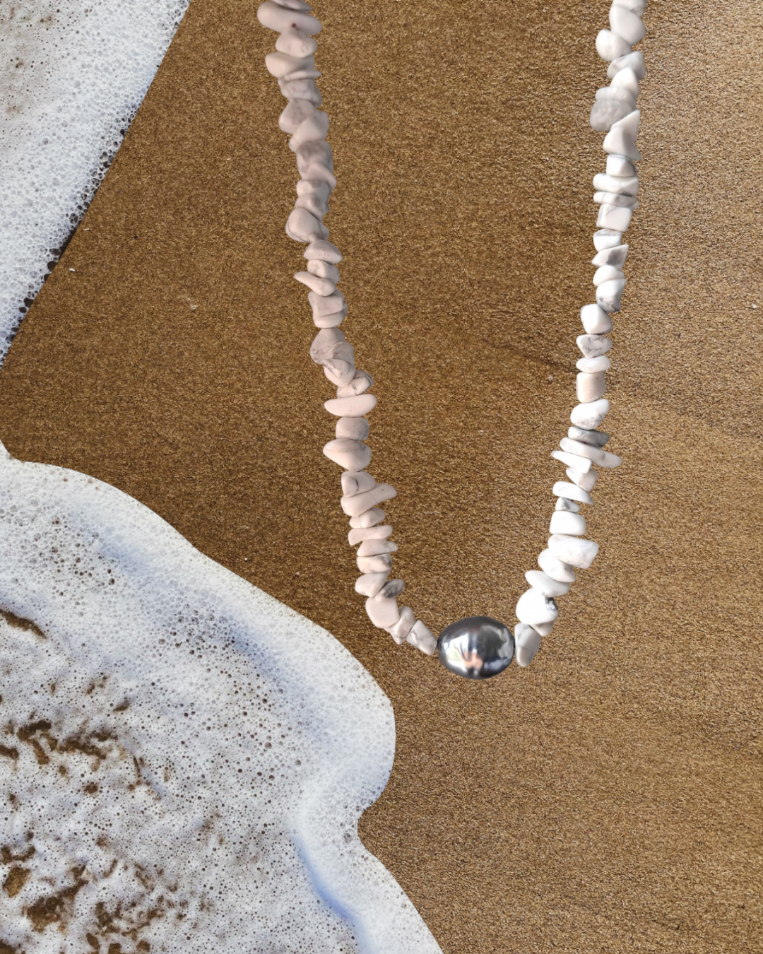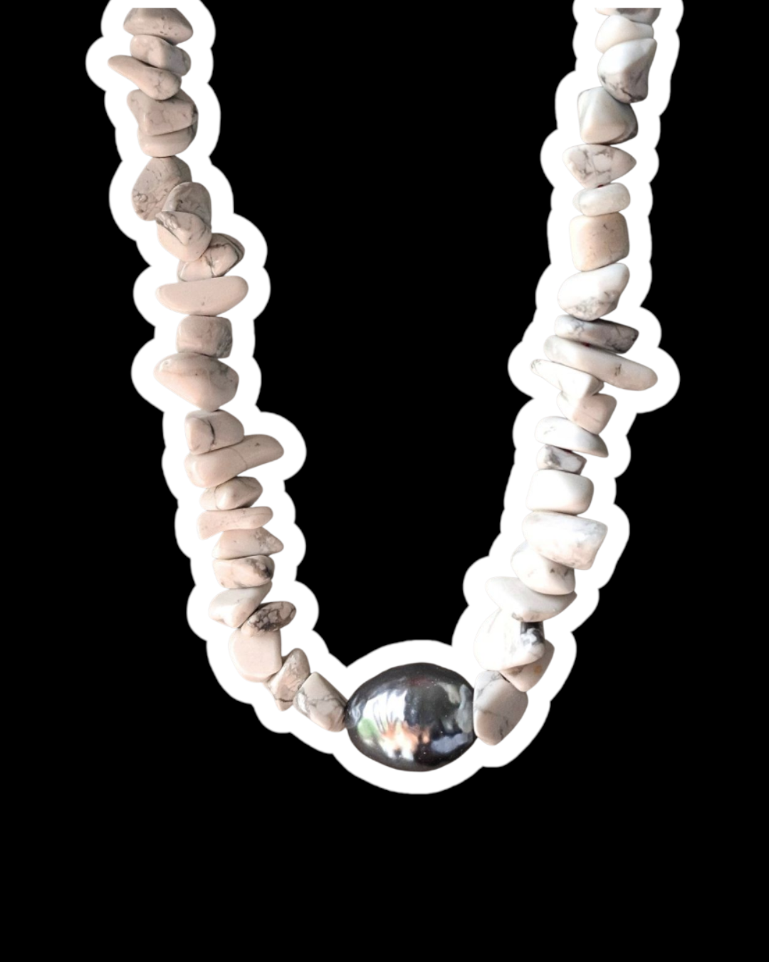 Colar de howlitas brancas e pérola shell cinza. Acabamento em prata 925. Possui extensor. 45cm.