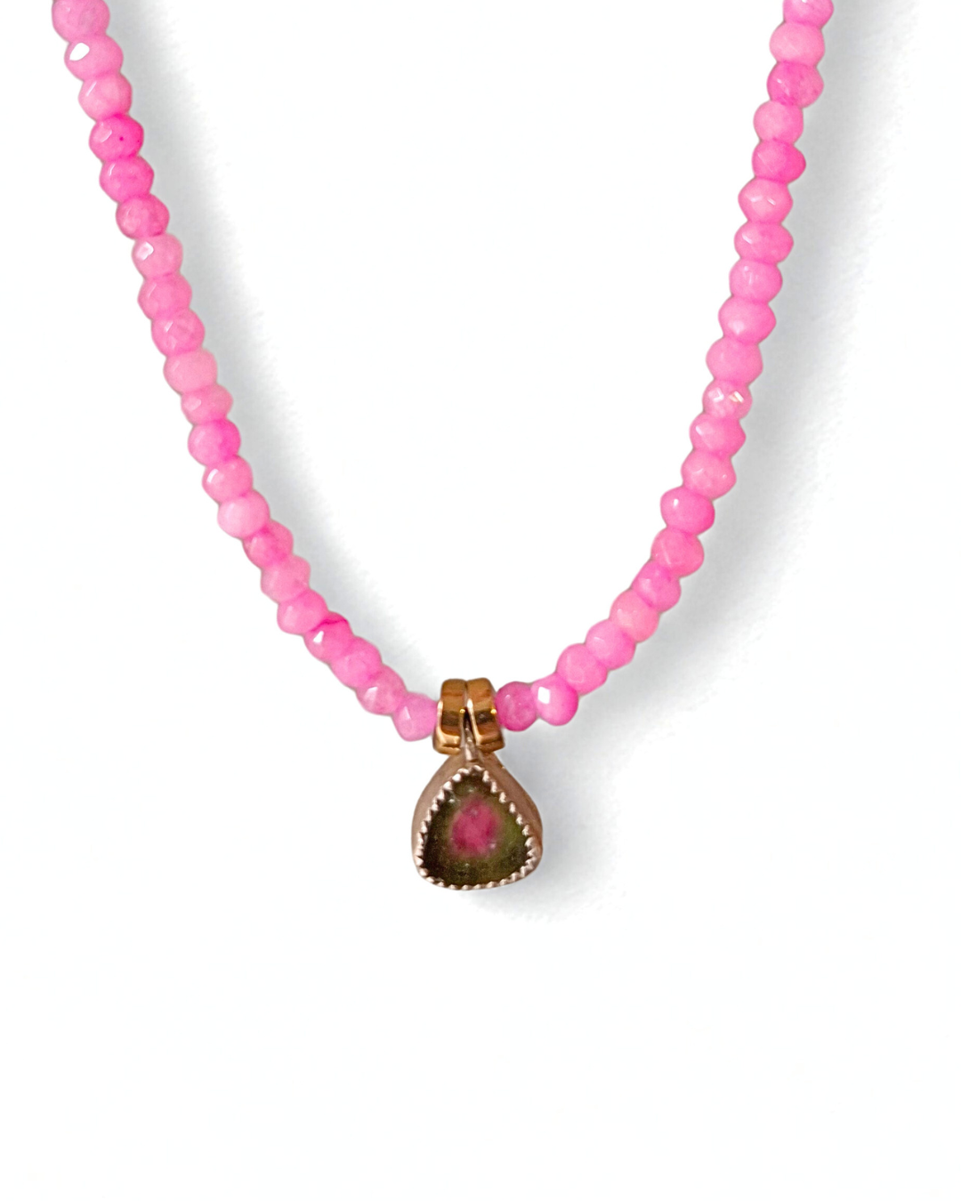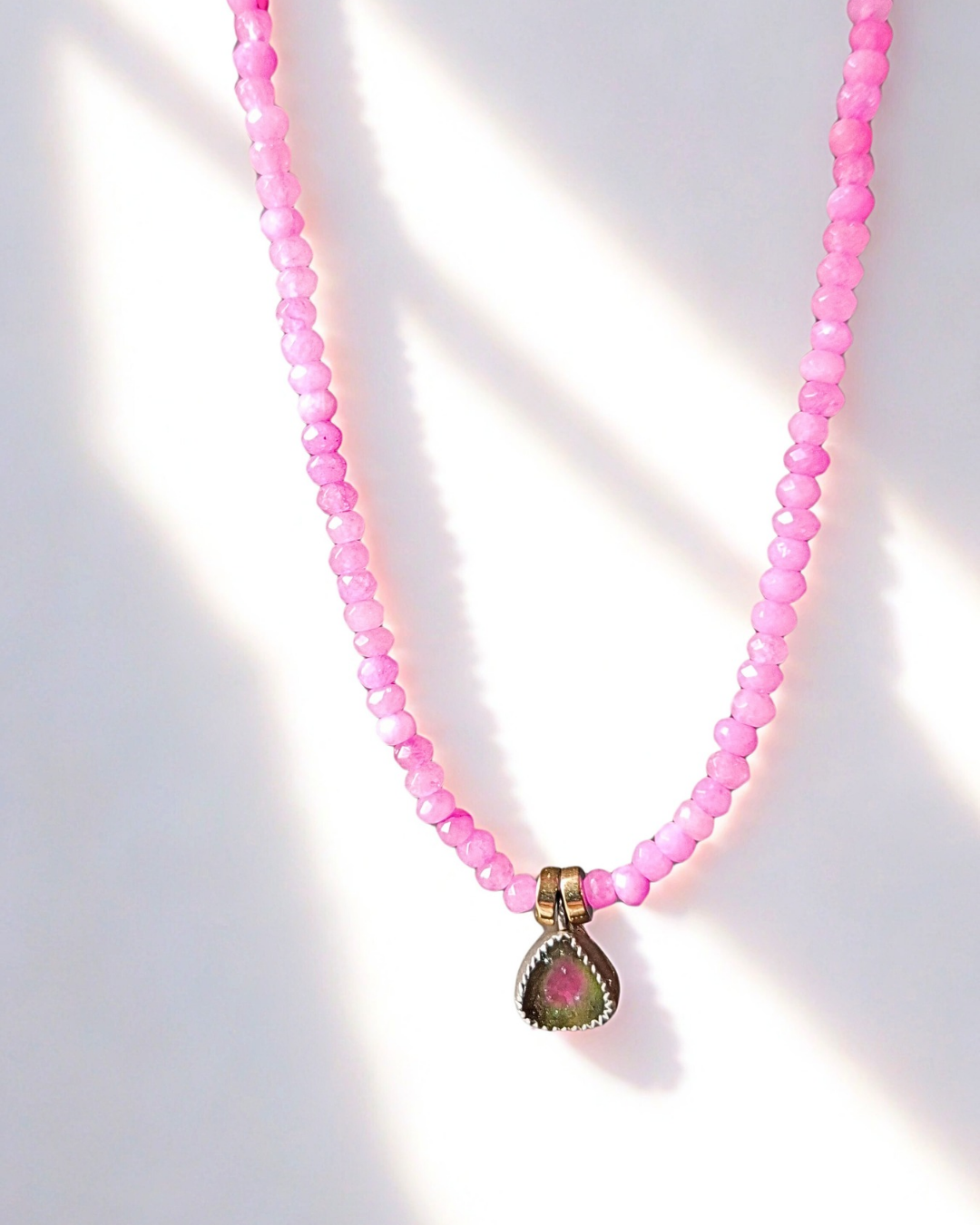 Colar de pedras naturais jade rosa e pingente em prata 925 de turmalina melancia. 40cm de comprimento e 5cm de extensor em prata 925.