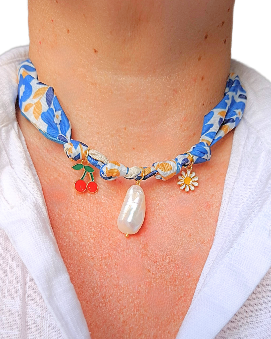 Colar com lenço estampado e pingentes charm cereja, flor e pérola barroca. Possui ponteiras e fecho lagosta.
