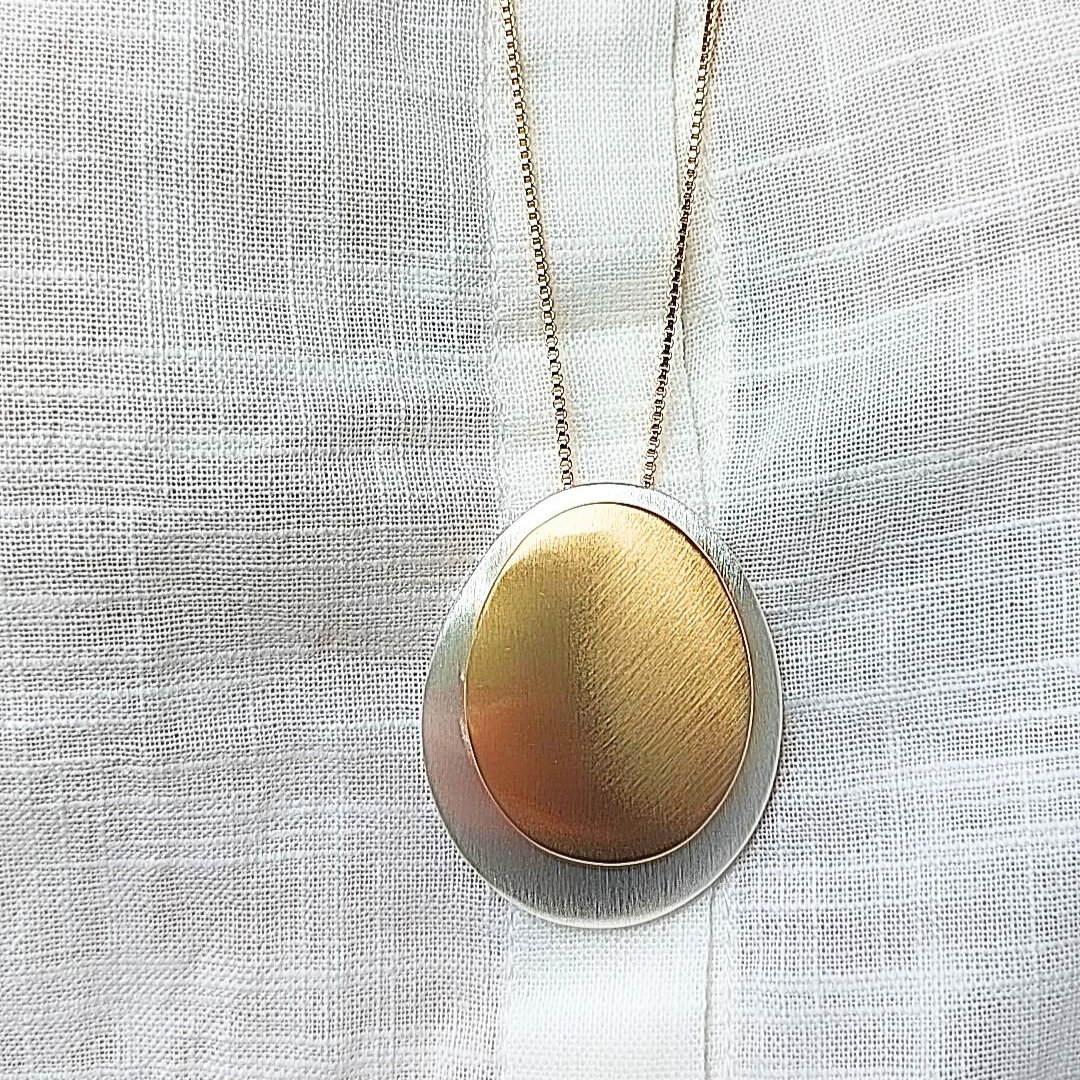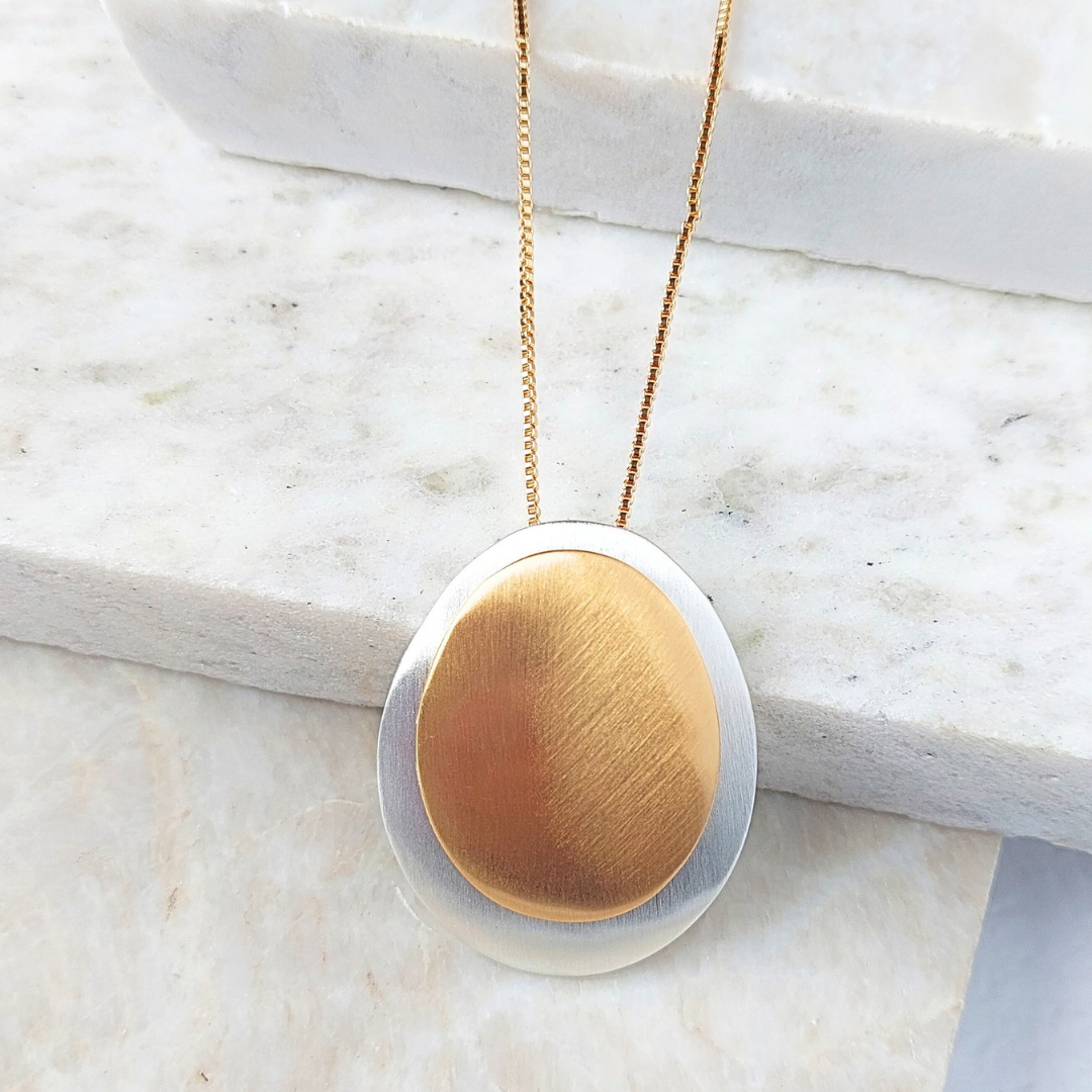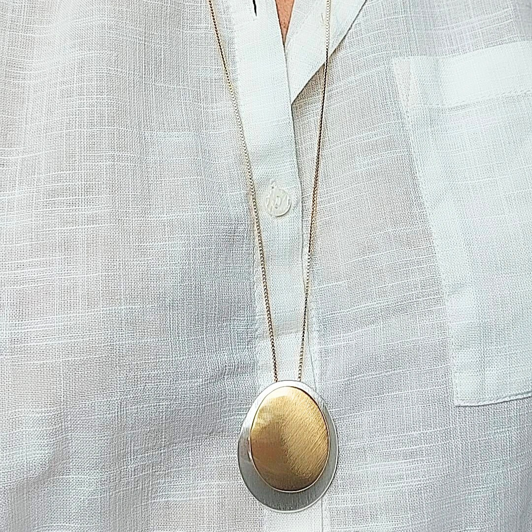 Colar longo com mix de banhos no ródio e no ouro, modelo placas ovais. 80cm de comprimento.