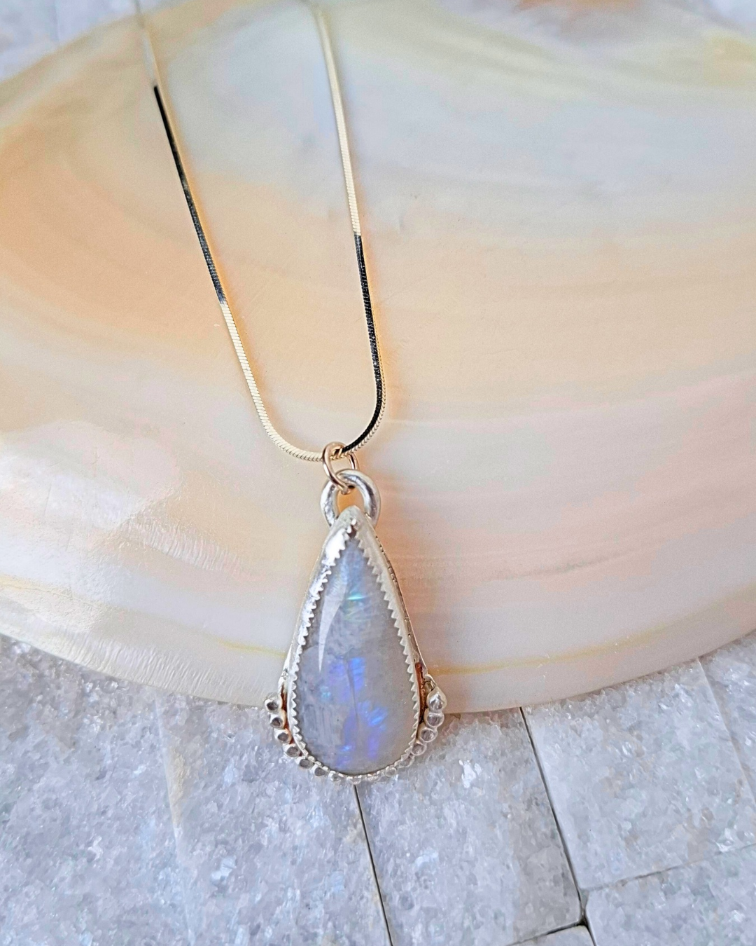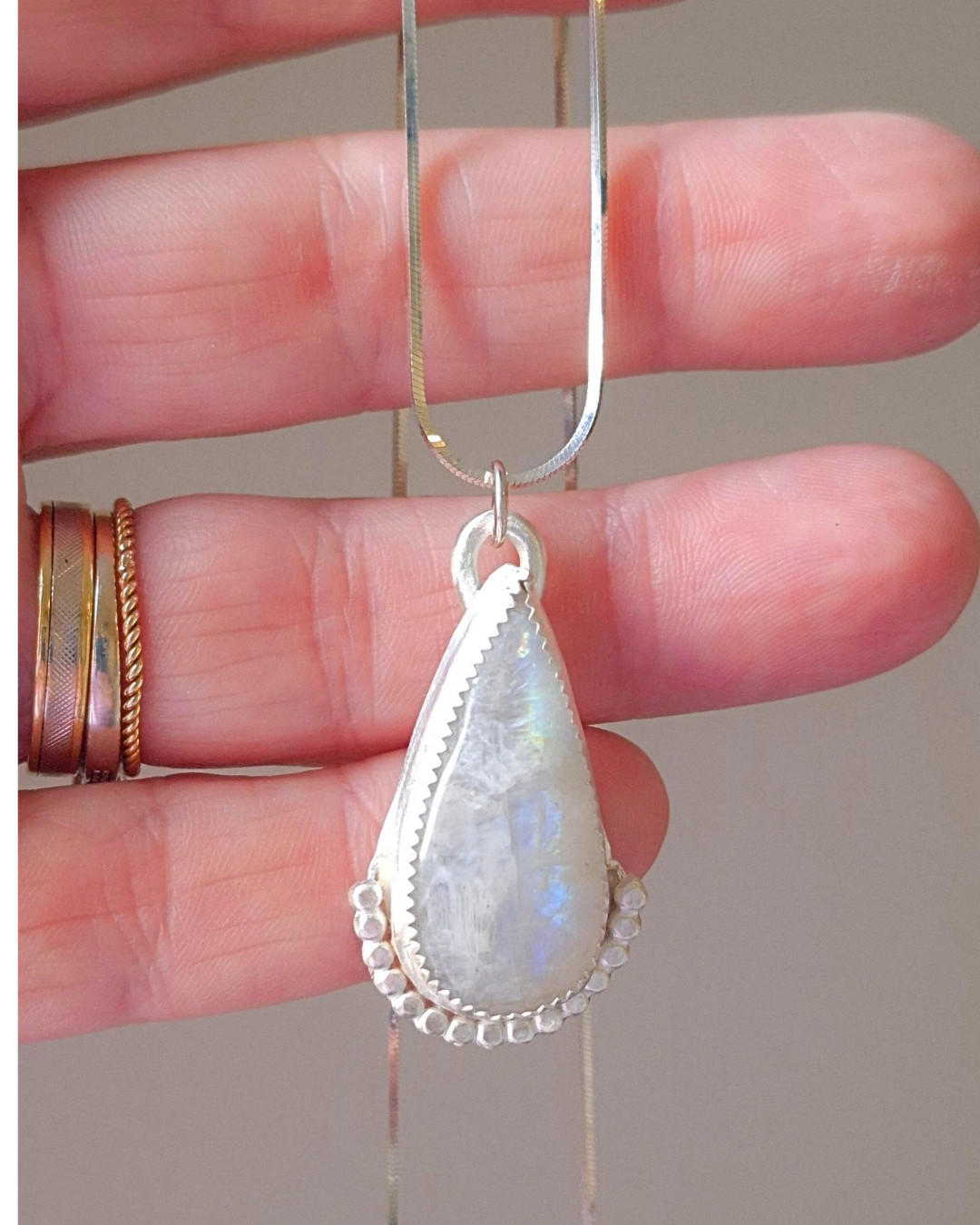 Colar em prata 925 e 950 com pedra da lua em gota. Pedra natural e corrente rabo de rato de 50cm de comprimento.