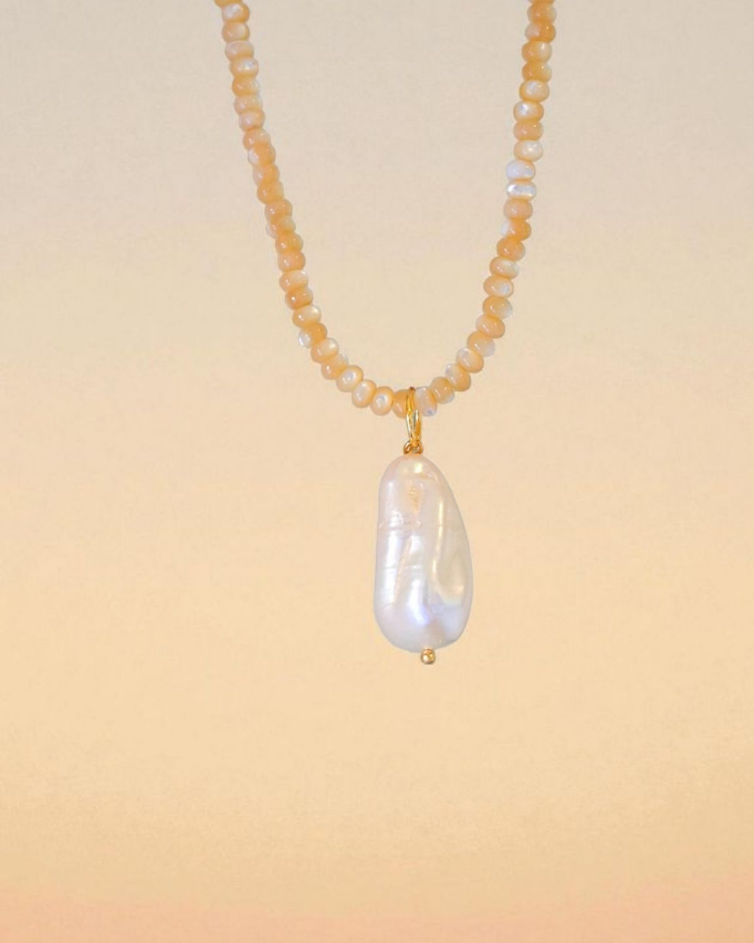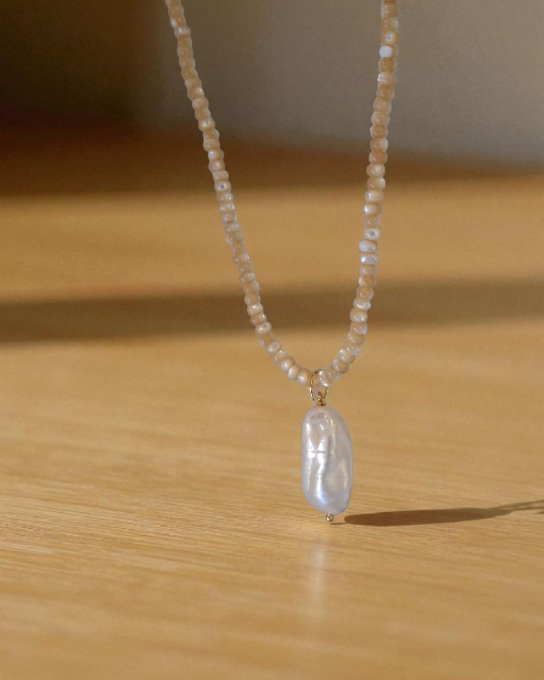 Colar em pedras naturais madrepérola com pingente de pérola barroca. 45cm e extensor.
