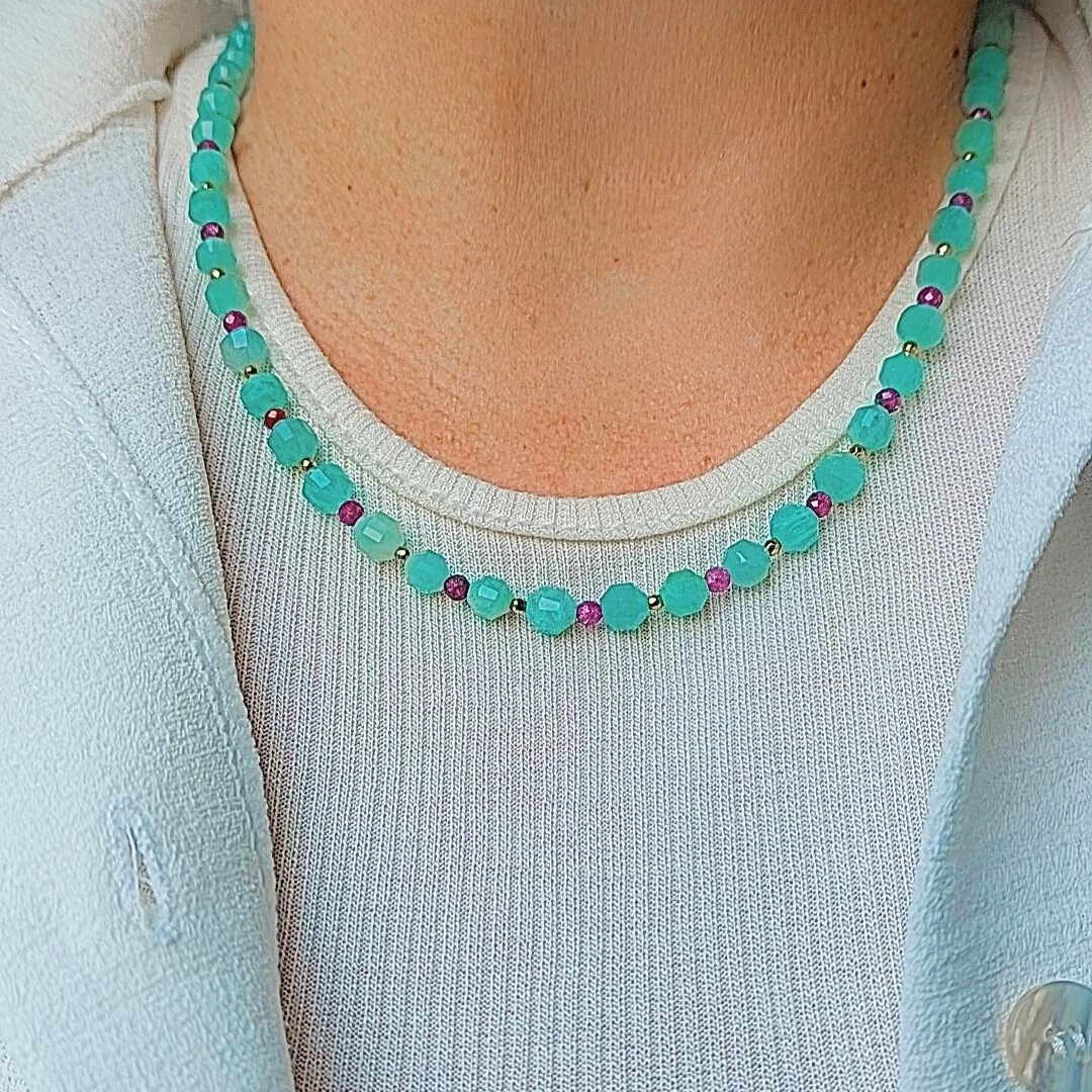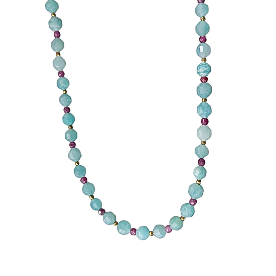 Colar de pedras naturais amazonita, rubi e hematitas douradas. Acabamento em prata 925.