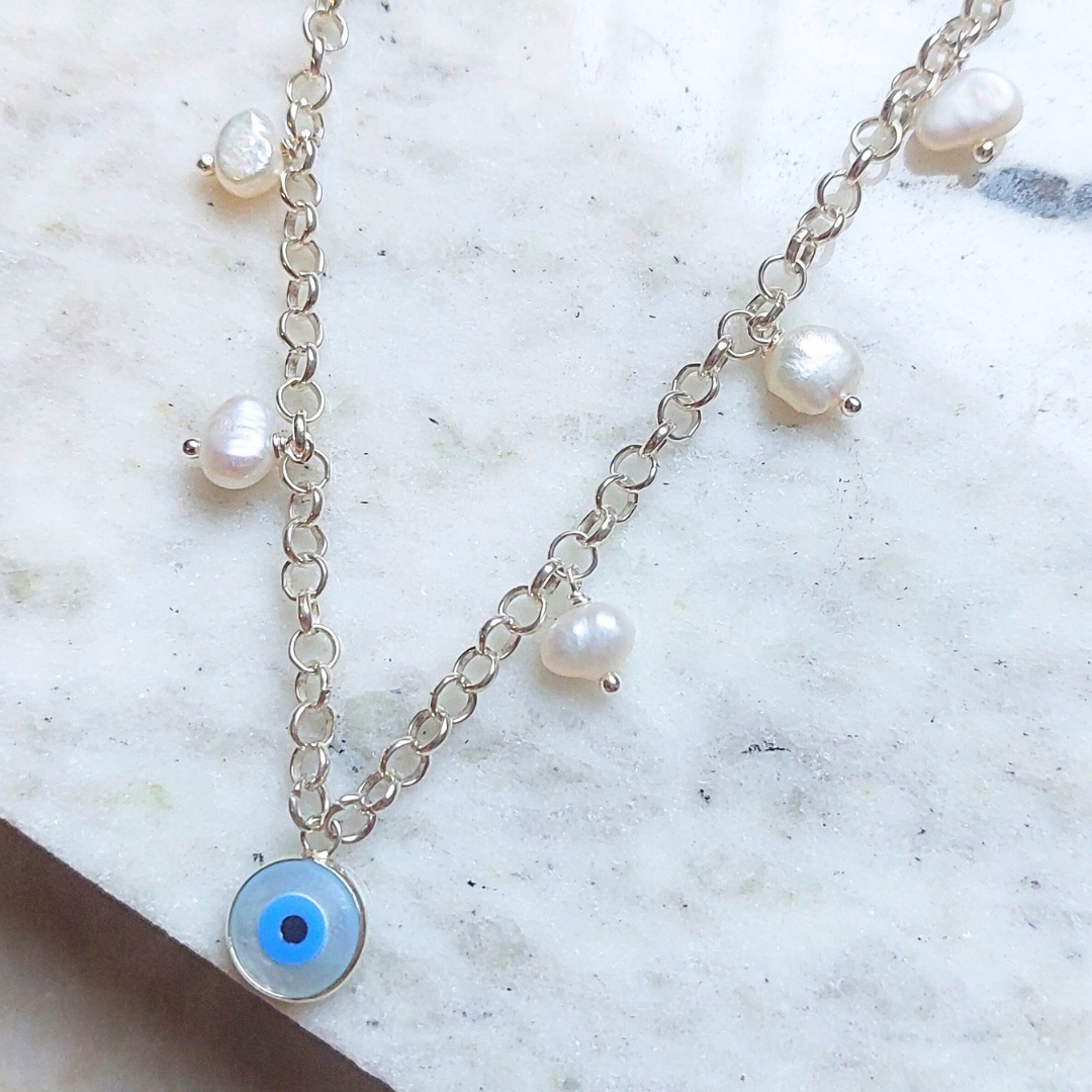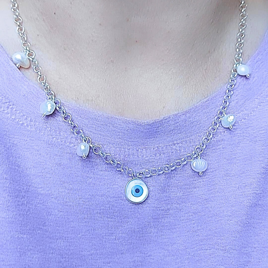Colar em prata 925, pérolas naturais de água doce e pingente de olho grego em madrepérola. 45cm de comprimento e 5cm de extensor.