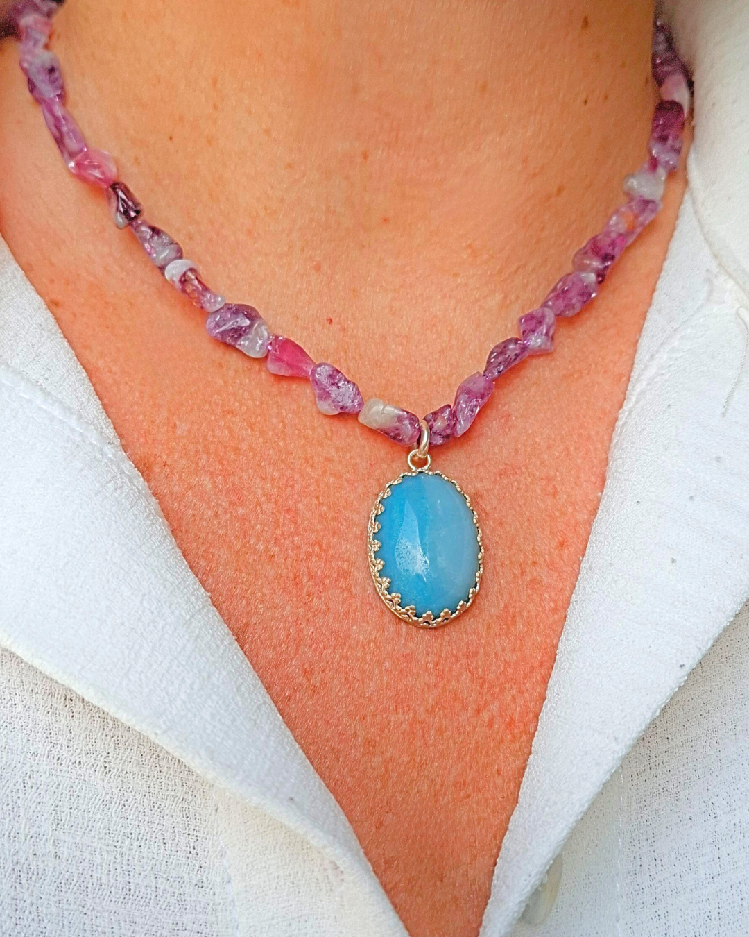 Colar em pedras naturais turmalina rosa bruta e pingente de pedra aventurina azul e prata 925. 45cm de comprimento e 5cm de extensor em prata 925.