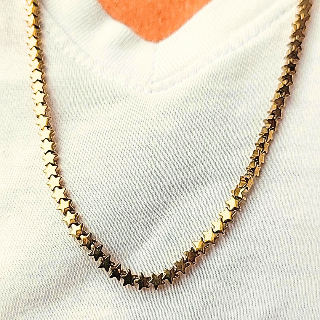 Colar de estrelas de pedras naturais hematita dourada. 70cm de comprimento e 10cm de extensor. Acabamento em prata 925.